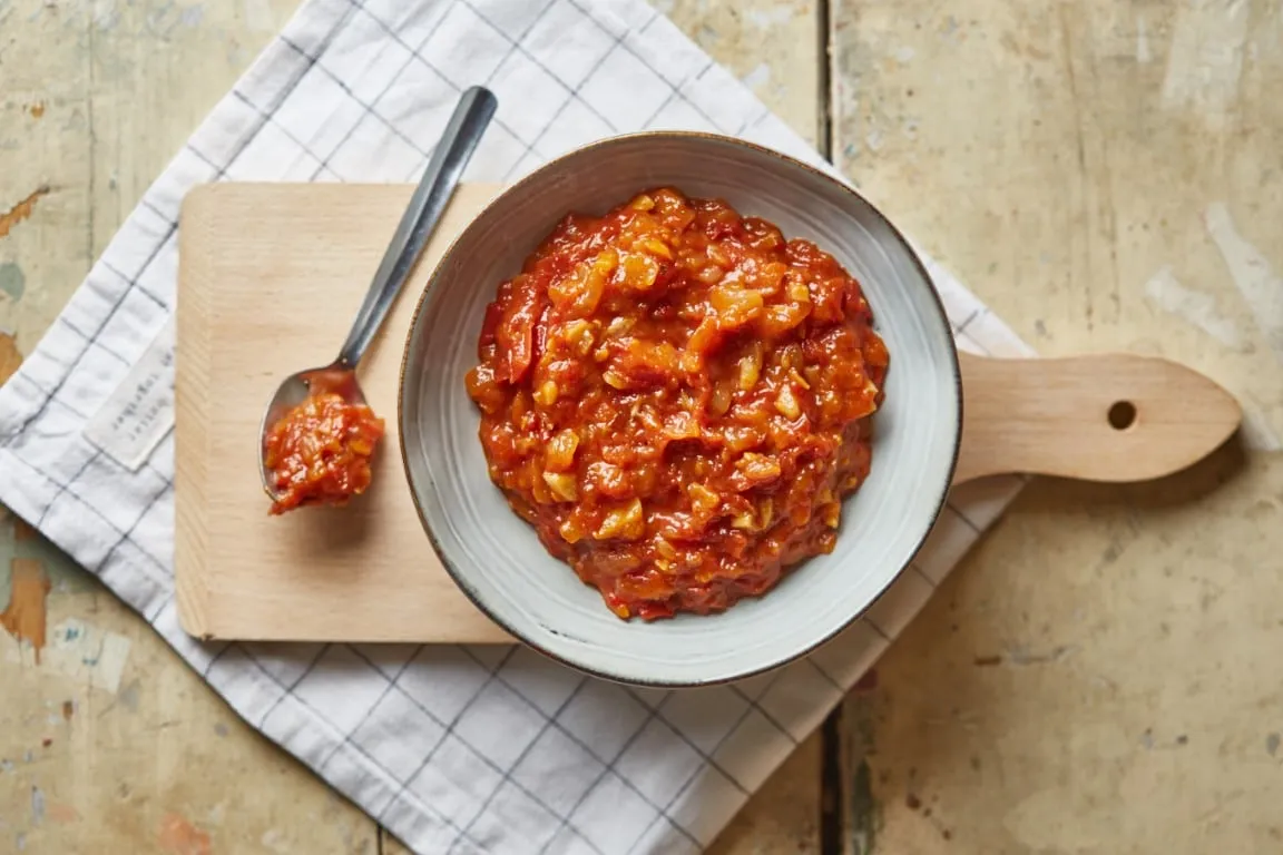 A paradicsomchutneyhoz az olajon üvegesre pároljuk az apróra vágott hagymát. Sózzuk, borsozzuk, és rádobjuk az apróra vágott fokhagymát és gyömbért. Addig pirítjuk, amíg enyhe aranybarna színt nem kap a hagyma.