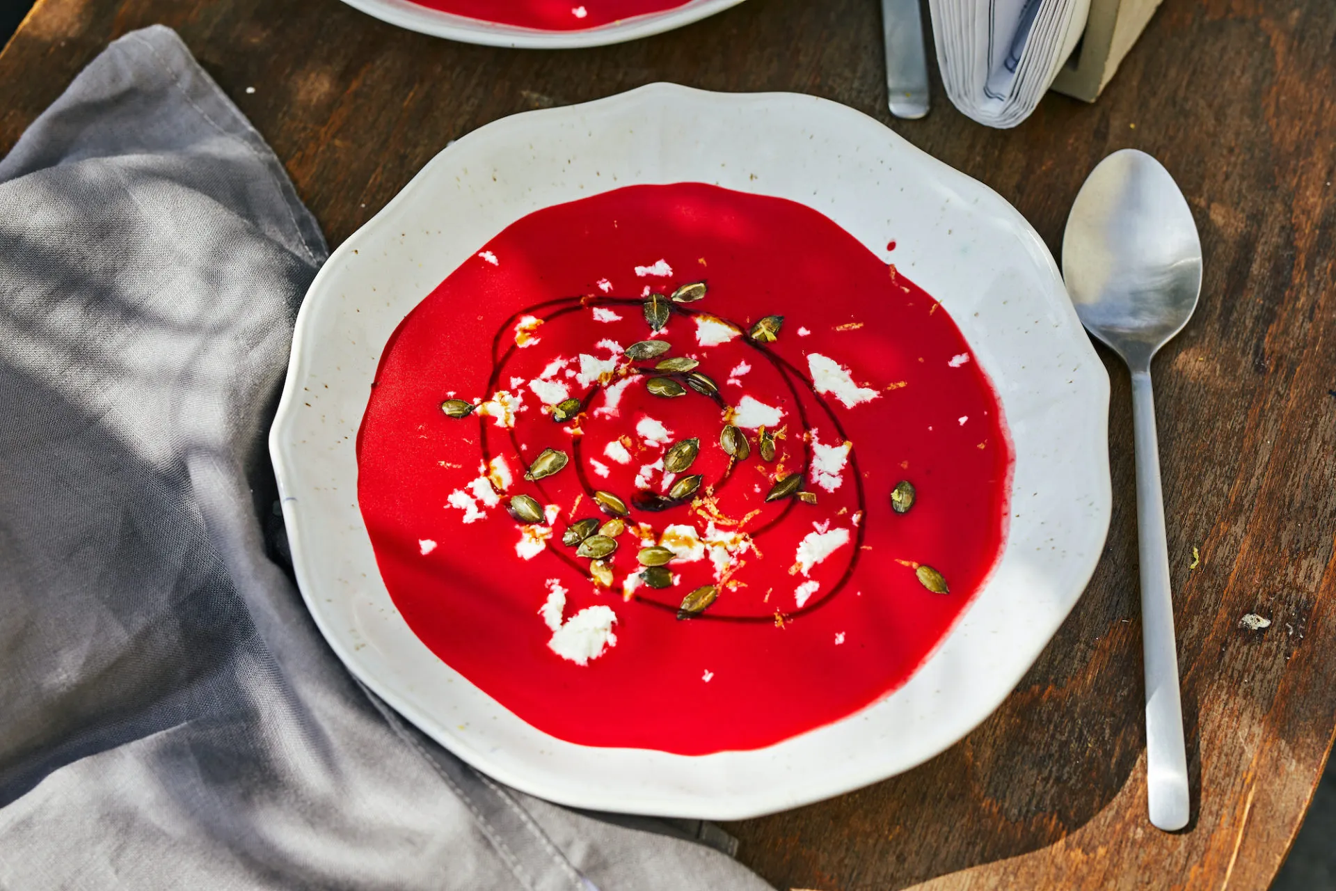 Az olajon, egy lábasban 2-3 perc alatt megdinszteljük a finomra vágott hagymát, majd hozzáadjuk a zúzott fokhagymát és a nagyobb darabokra vágott főtt céklát is. 1-2 perc pirítás után felöntjük annyi alaplével, ami kb. 2 ujjnyira ellepi a céklát. Ha felforrt, sózzuk, borsozzuk, és hozzáadjuk a cukrot is. Közepes lángon 5 percig főzzük, majd egy botmixer segítségével lezúzzuk.