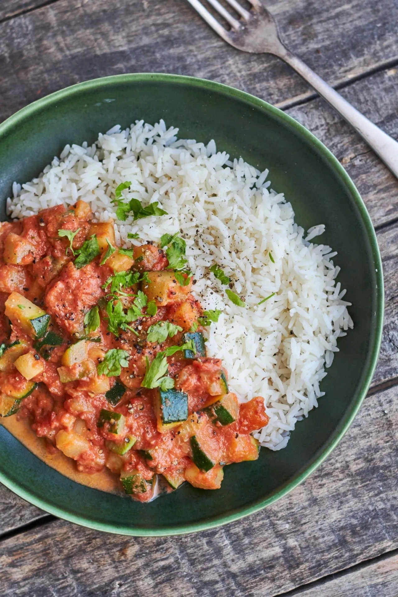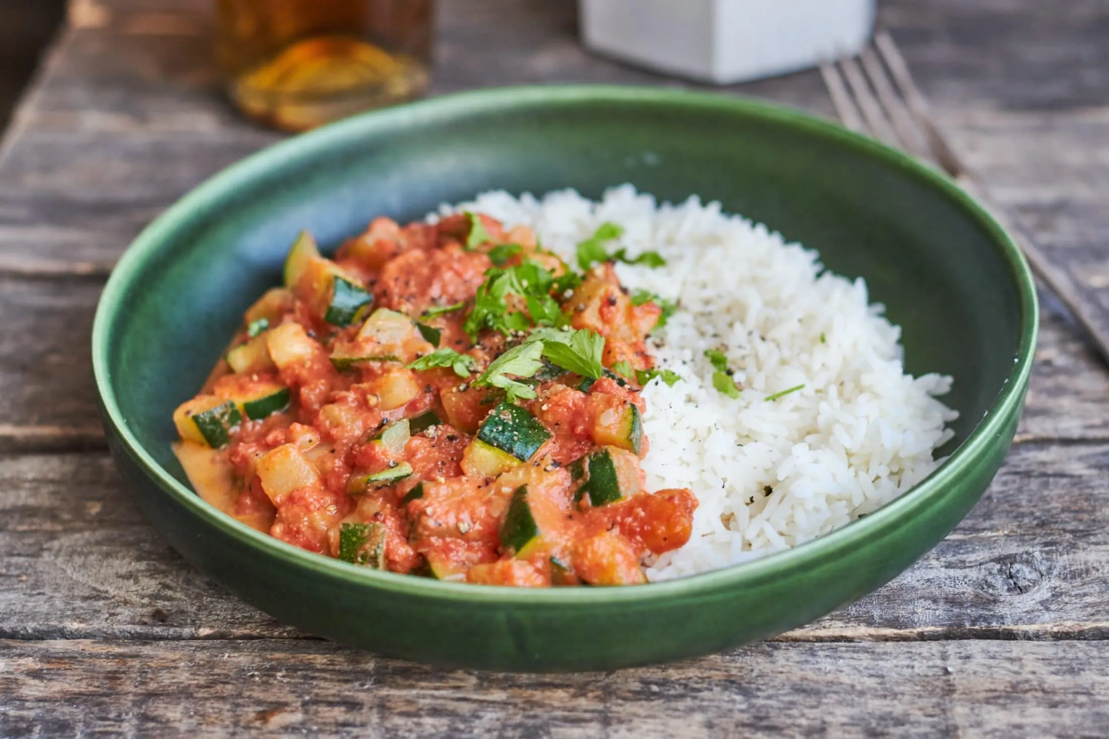 A rizst a szokásos módon megfőzzük. Közben a hagymát és a fokhagymát apróra vágjuk, és elkezdjük pirítani az olajon. A cukkinit is kisebb kockákra vágjuk, és a hagymához adjuk. Pár percig pirítjuk, hogy szép kérget kapjon, majd mehet rá a passata, só, bors, a balzsamecet, a cukor, majd a tejszín is. Egyet forralunk rajta, és kész is vagyunk. A rizzsel tálaljuk.