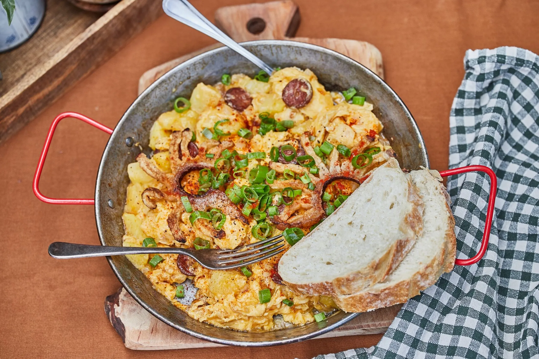 Ekkor hozzáadjuk a felvert tojásokat és a legerősebb hőfokon a kívánt állagig pirítjuk. Nem javaslom, hogy kiszárítsuk (én maximum 30 másodpercig sütöttem), és közben csak óvatosan kevergessük, ne törjük teljesen morzsalékossá a rántottát. Tálalásnál a tetejére helyezzük a szalonnát, megszórjuk az újhagyma frissen aprított zöldjével és fűszerpaprikával, és friss kenyérrel kínáljuk.