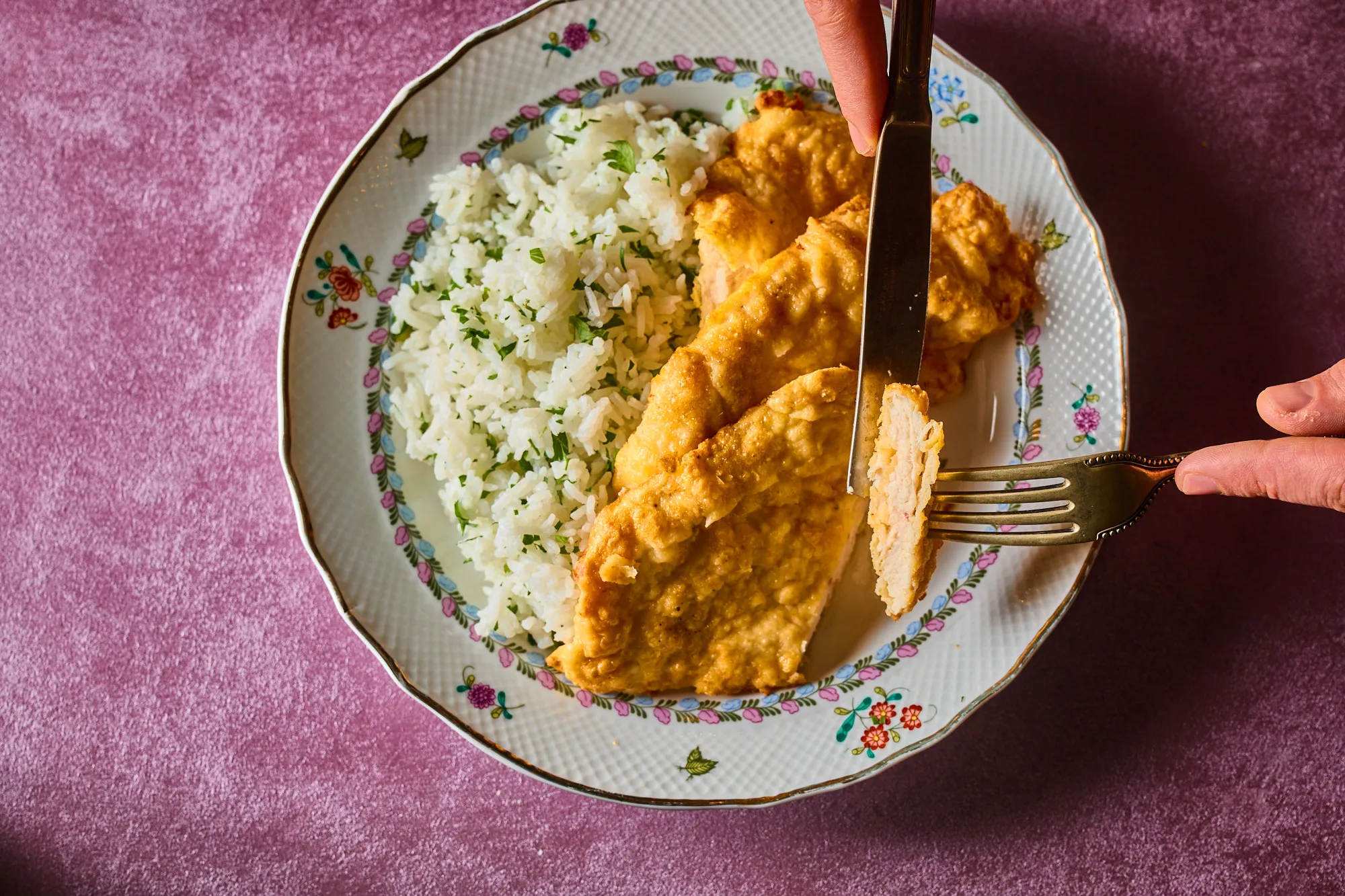A készre sült szaftos párizsi csirkemellet ízlésünk szerinti körettel, de még forrón, frissen fogyasztjuk.