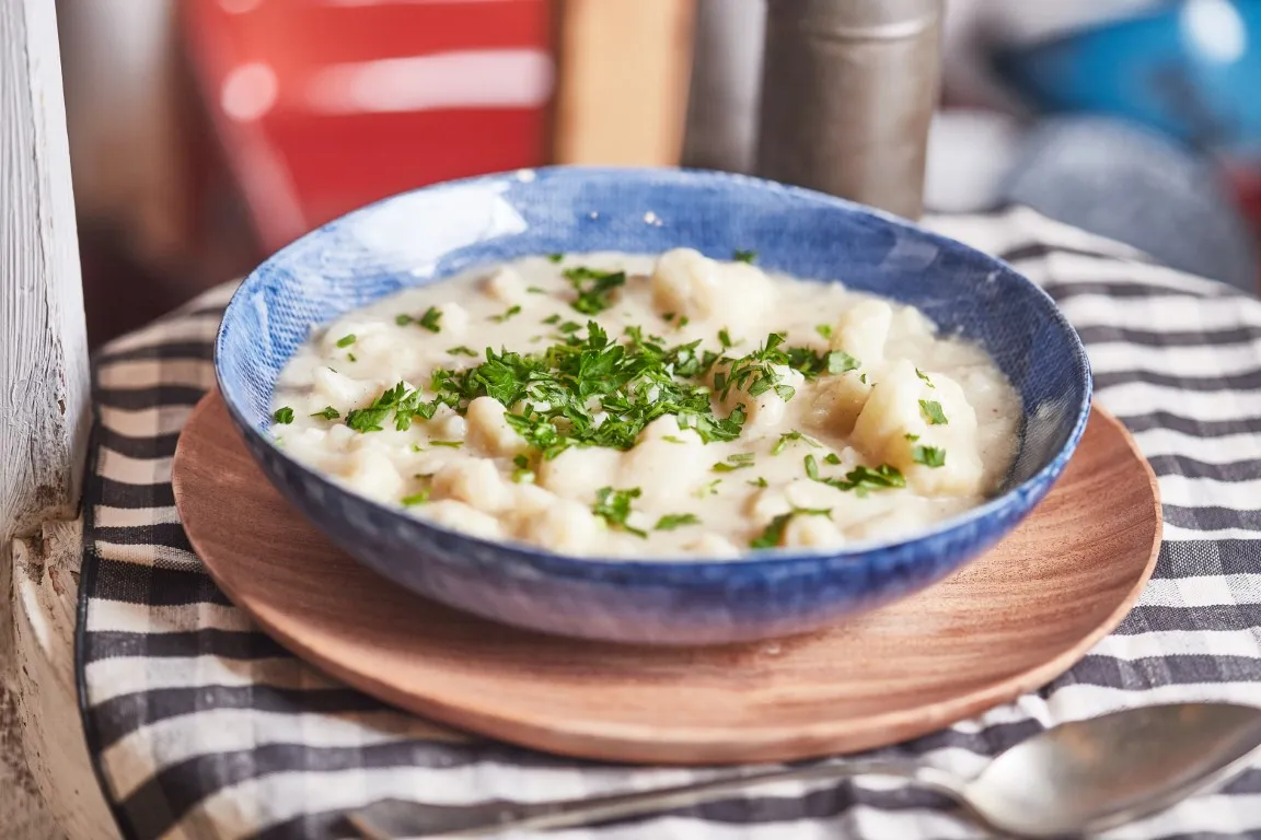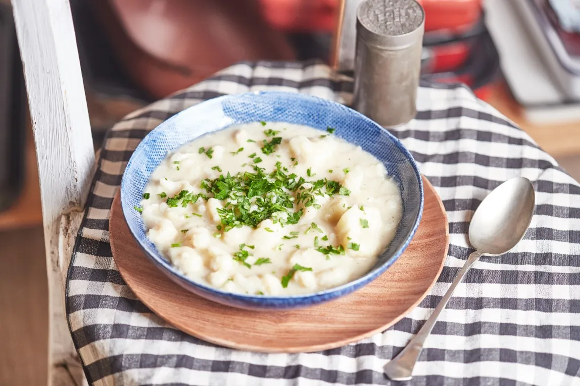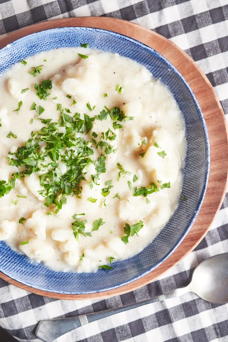 A hagymát, fokhagymát finomra vágjuk, és az olajon megdinszteljük, majd rádobjuk a rózsáira szedett karfiolt, és a víz kb. felével majdnem teljesen készre pároljuk. Közben sózzuk, borsozzuk és belereszeljük a szerecsendiót. Ezután a maradék vizet csomómentesre keverjük a liszttel, majd hozzáadjuk a tejszínt.