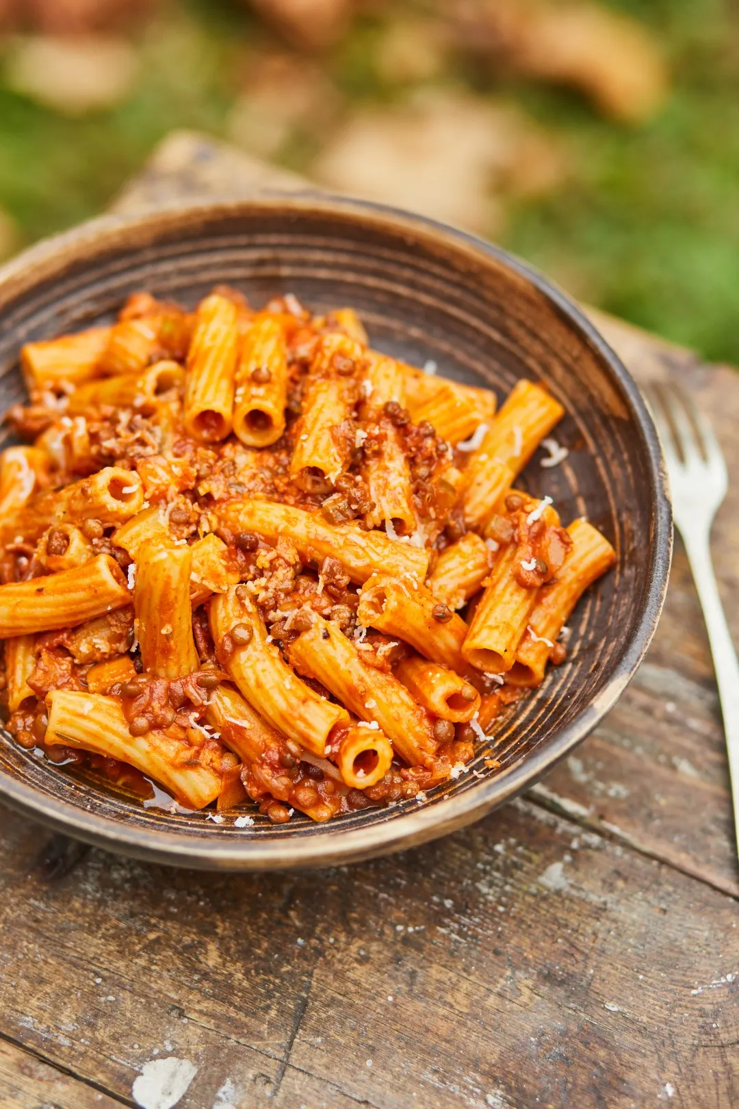 Ezután rátesszük a paradicsompürét, rozmaringot, kakukkfüvet, sózzuk, borsozzuk és még így is pirítjuk 2-3 percig. Felöntjük a passatával és a félretett főzővízzel. Felforraljuk, majd lassú tűzön 15 percig rotyogtatjuk. Közben belerakjuk a lencsét és ha letelt az idő elzárjuk. Belereszeljük a parmezánt, összeforgatjuk a megfőtt tésztával és a baconchipsszel, végül elkeverjük benne az olívaolajat.