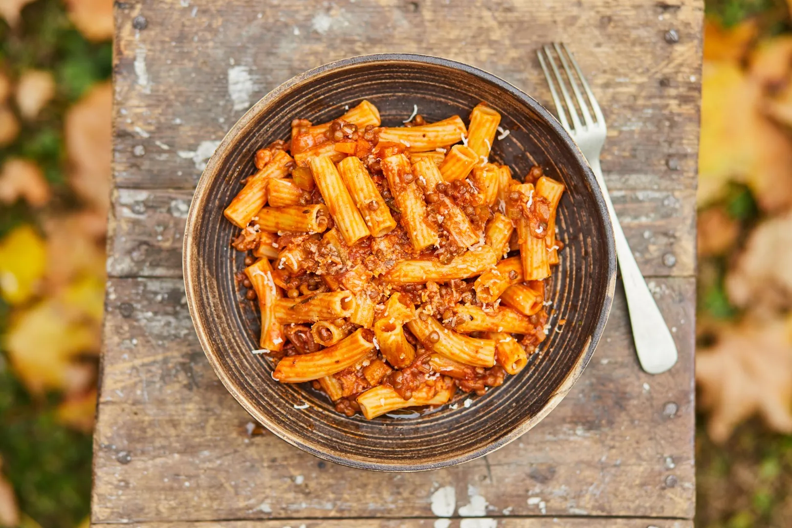 A tésztát sós vízben al dentére főzzük és a főzőléből 1 decit félre rakunk, majd a tésztát leszűrjük. Egy nagy lábasban közepes hőmérsékleten alaposan lepirítjuk az apróra vágott bacont, hogy kisüljön a zsírja. Ha megpirult, kivesszük és a visszamaradt zsiradékon 3-4 percig pirítjuk az finomra vágott hagymát, zellert, répát és fokhagymát.