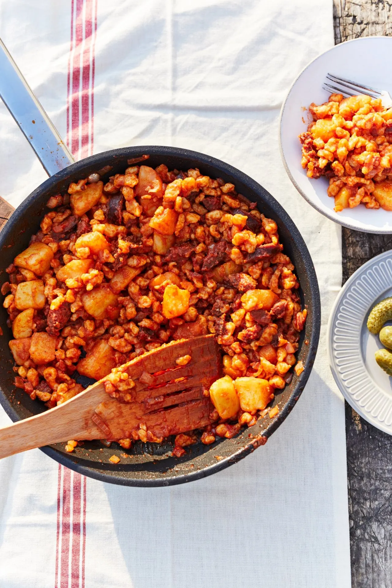 A raguhoz az apróra vágott szalonnát félig zsírjára sütjük, ekkor jöhet rá a felkockázott kolbász, majd ha már a kolbász is elkezdte kiengedni a zsírját, mehet rá a felaprított hagyma. Sózzuk, borsozzuk, rárakjuk a sűrített paradicsomot, és ha lepirult, felöntjük a vízzel. Ha kicsit besűrűsödött, rárakjuk a paprikát, elkeverjük, és mehet bele a krumpli, majd a nokedli. Alaposan összeforgatjuk, és kész.