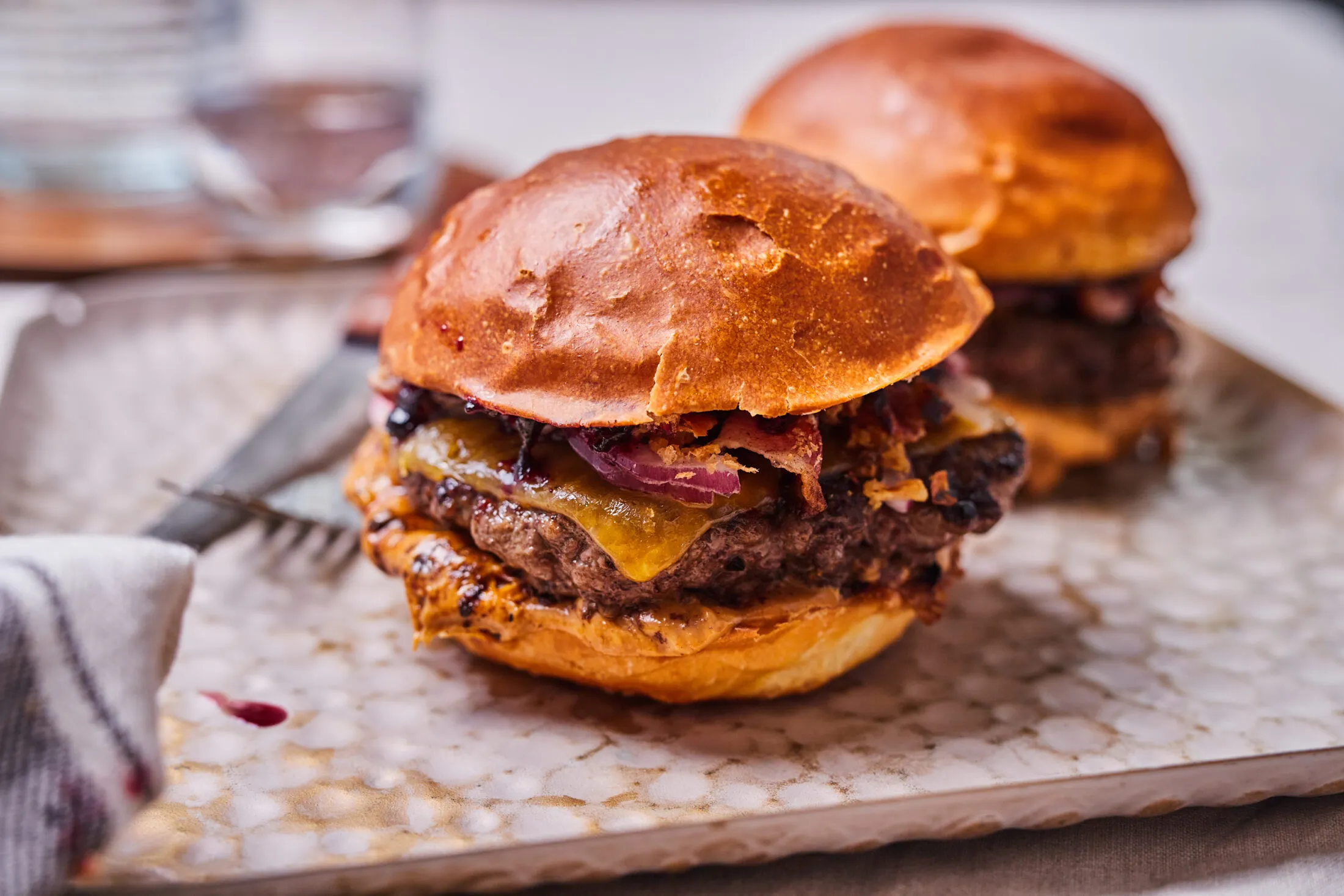 A hamburgerbucikat kettényessük és forró serpenyőben lepirítjuk őket a hússütés után visszamaradt zsíron. A bucik alját megkenjük egy kevés mogyoróvajjal, a tetejüket pedig áfonyalekvárral. Az aljakra helyezzük a húsokat, arra jöhet a pirított bacon, teszünk rá szeletekre vágott lila hagymát és pirított hagymát, és végül megkoronázzuk a bucitetőkkel.