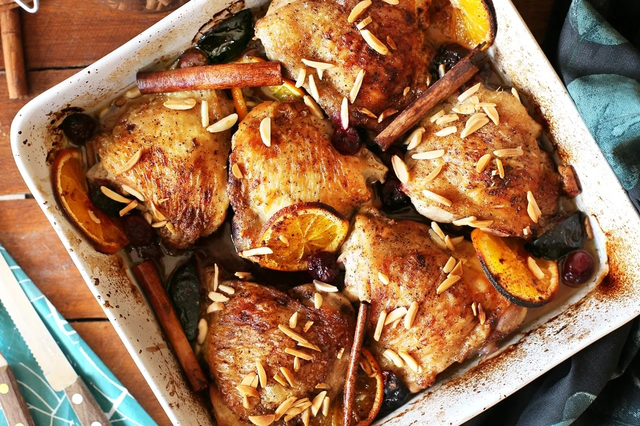 A fűszeres csirkecomb ezúttal csirke felsőcombból készül. Ehhez a combokat sózzuk, borsozzuk és egy serpenyőben először a bőrös részével lefelé elkezdjük sütni addig amíg kissé lepirul (kb. 10 perc), majd megfordítjuk és újabb kb. 6 percig sütjük. Egy nagyobb hőálló tálba rakjuk a csirkéket a bőrös részükkel felfelé, körbeszórjuk a narancsszeletekkel, meggyel, szederrel.