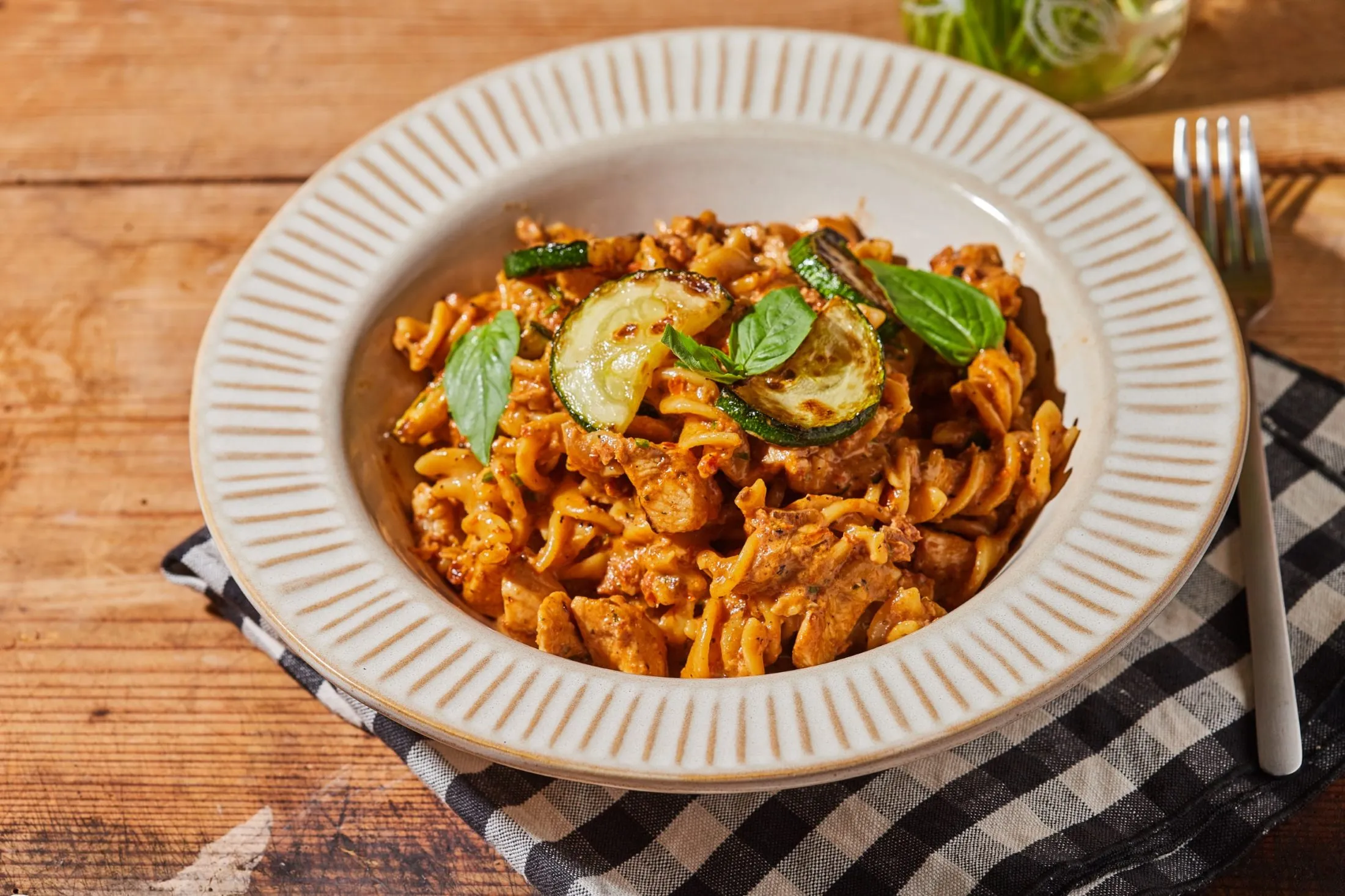 Végül a csirkéhez keverjük az időközben megfőtt tésztát, és legalább 200 ml-t a főzővizéből is, majd jöhet bele a sült cukkini és az apróra vágott friss petrezselyem. Összeforgatjuk a tésztát, és tálalunk.