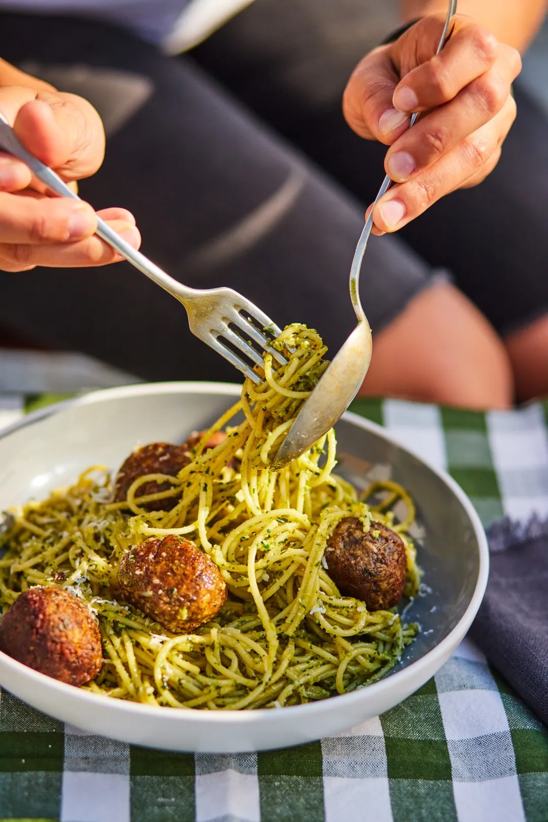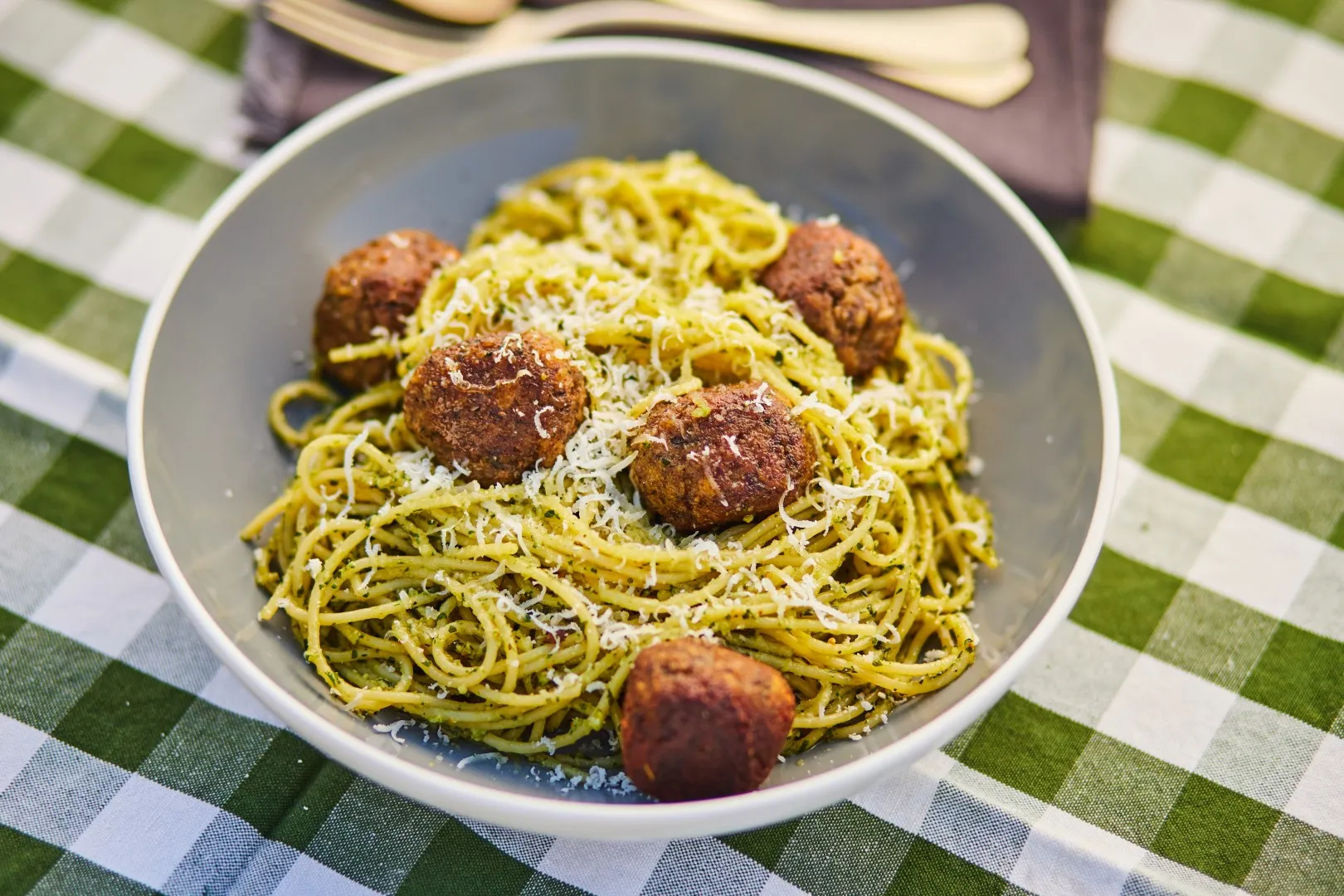 A spagettit sós vízben kifőzzük, leszűrjük. A golyókhoz a gombát nagy darabokra vágjuk és egy száraz serpenyőben alaposan lepirítjuk, úgy, hogy amikor az összes nedvességet elfőtte, akkor dobunk rá 3 gerezd felszeletelt fokhagymát. Meglocsoljuk a Worcester szósszal, megszórjuk kakukkfűvel és elzárjuk. Egy aprítógépben lezúzzuk a gombát a tojással, keményítővel, panko morzsával, sóval, borssal és a maradék 1 gerezd fokhagymával, és golyókat formázunk belőle. Amíg megcsináljuk a pesztót, addig hagyjuk állni. A pesztóhoz a hozzávalókat egy aprítógépben lezúzzuk. Serpenyőt hevítünk és az olívaolajon megpirítjuk a golyókat és kivesszük. A tésztát ebbe a serpenyőbe rakjuk bele, összekeverjük a pesztóval és tálaljuk.