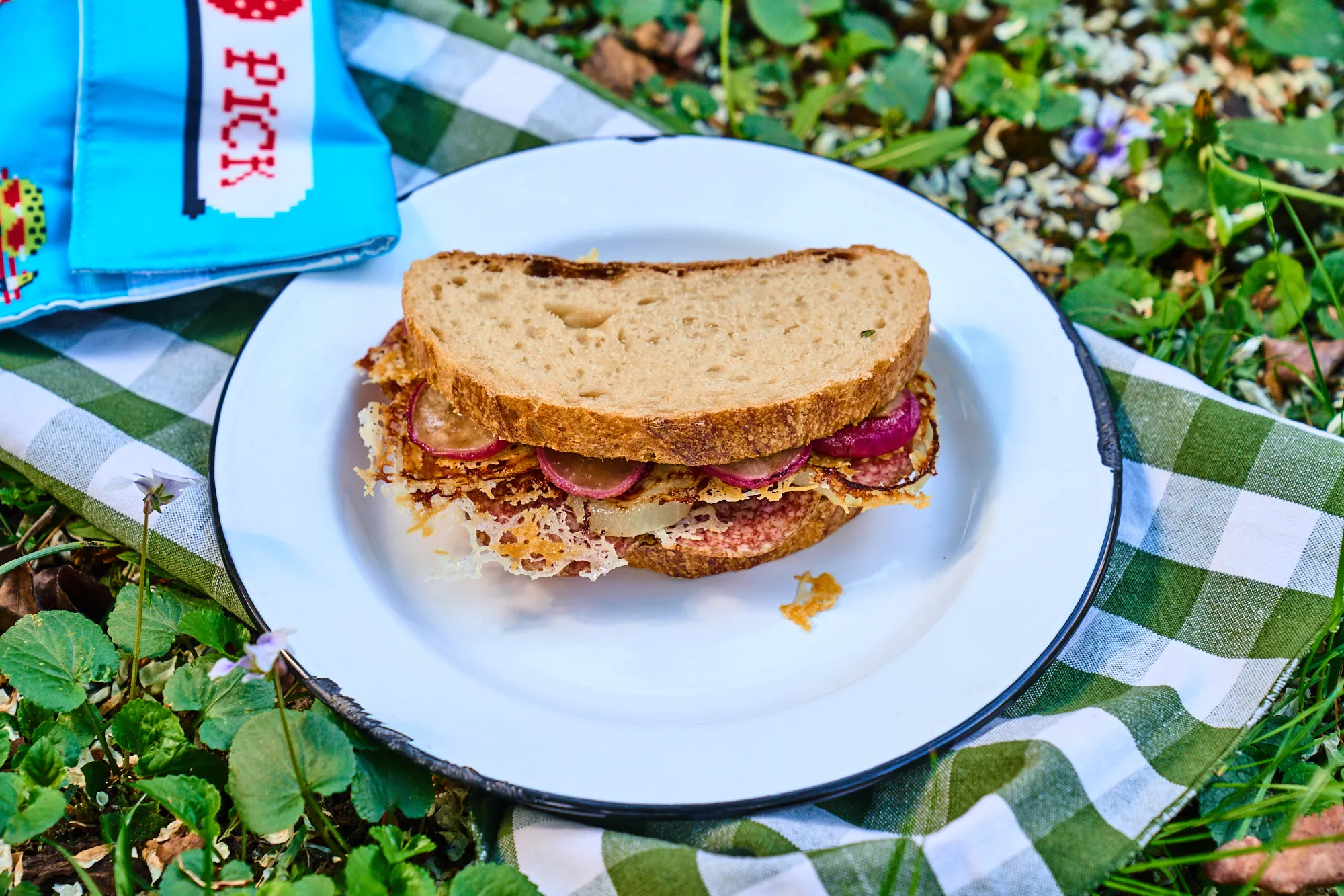 Felejtsd el a szikkadt, egyhangú szendvicseket! Ez a recept bebizonyítja, hogy a hátizsákból is előkerülhet egy igazi gourmet fogás. A klasszikus téliszalámi füstös ízét a selymes bazsalikomos pesztó és a ropogós, parmezánba sült hagymakarikák emelik új szintre, a fűszeres vajban pirított retek pedig olyan váratlan textúrát és frissességet ad az egésznek, amitől minden egyes harapás élmény lesz. Tökéletes üzemanyag a kaptatókhoz, és garantáltan a pihenők fénypontja lesz.
