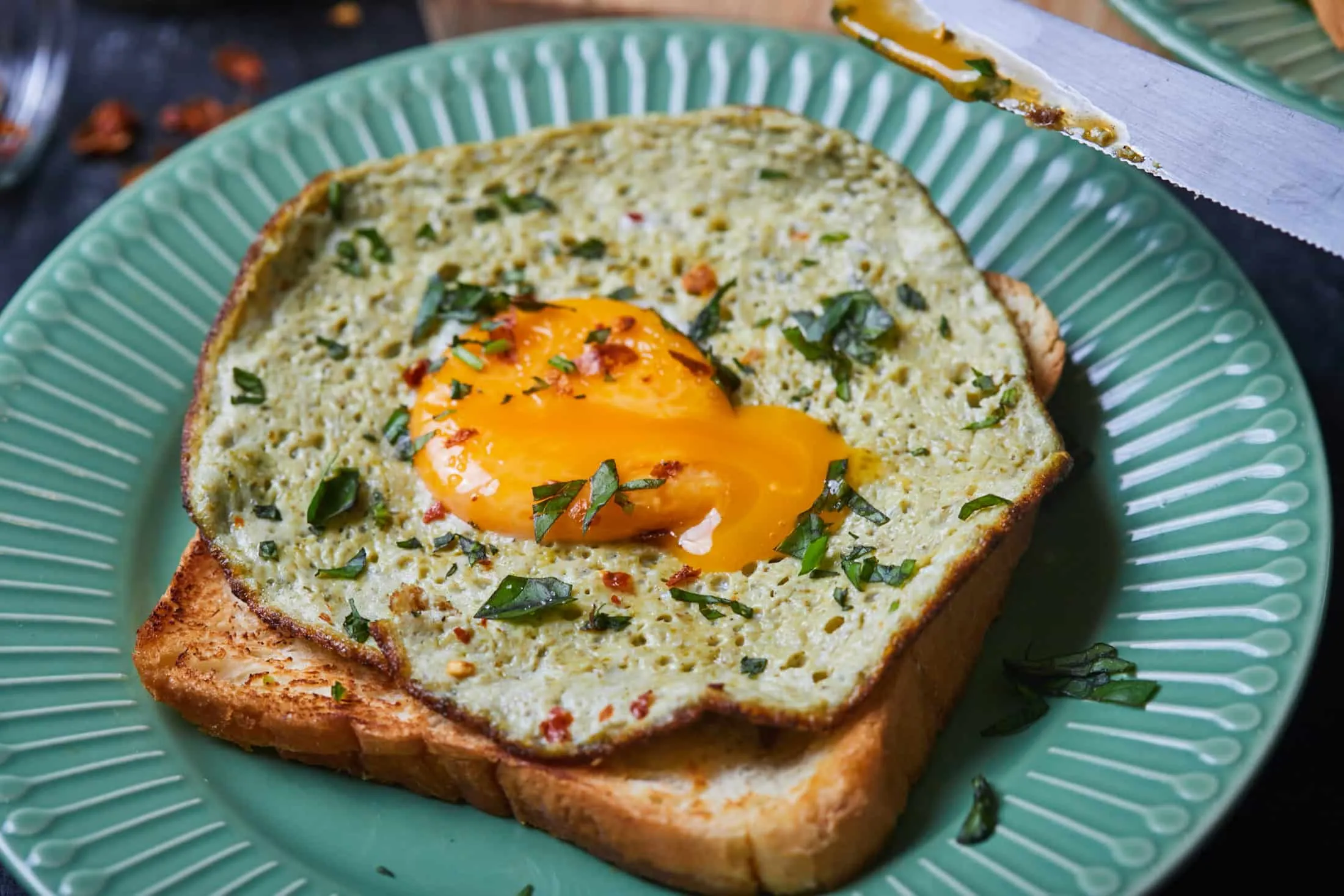 Egy serpenyőben kevés olívaolajon lepirítjuk a toastkenyereket, és mikor szép aranybarnák, ráhelyezzük a pesztós tükörtojásokat. Megszórjuk egy csipet sóval, frissen őrölt borssal, kevés chilivel és az aprított friss bazsalikommal.