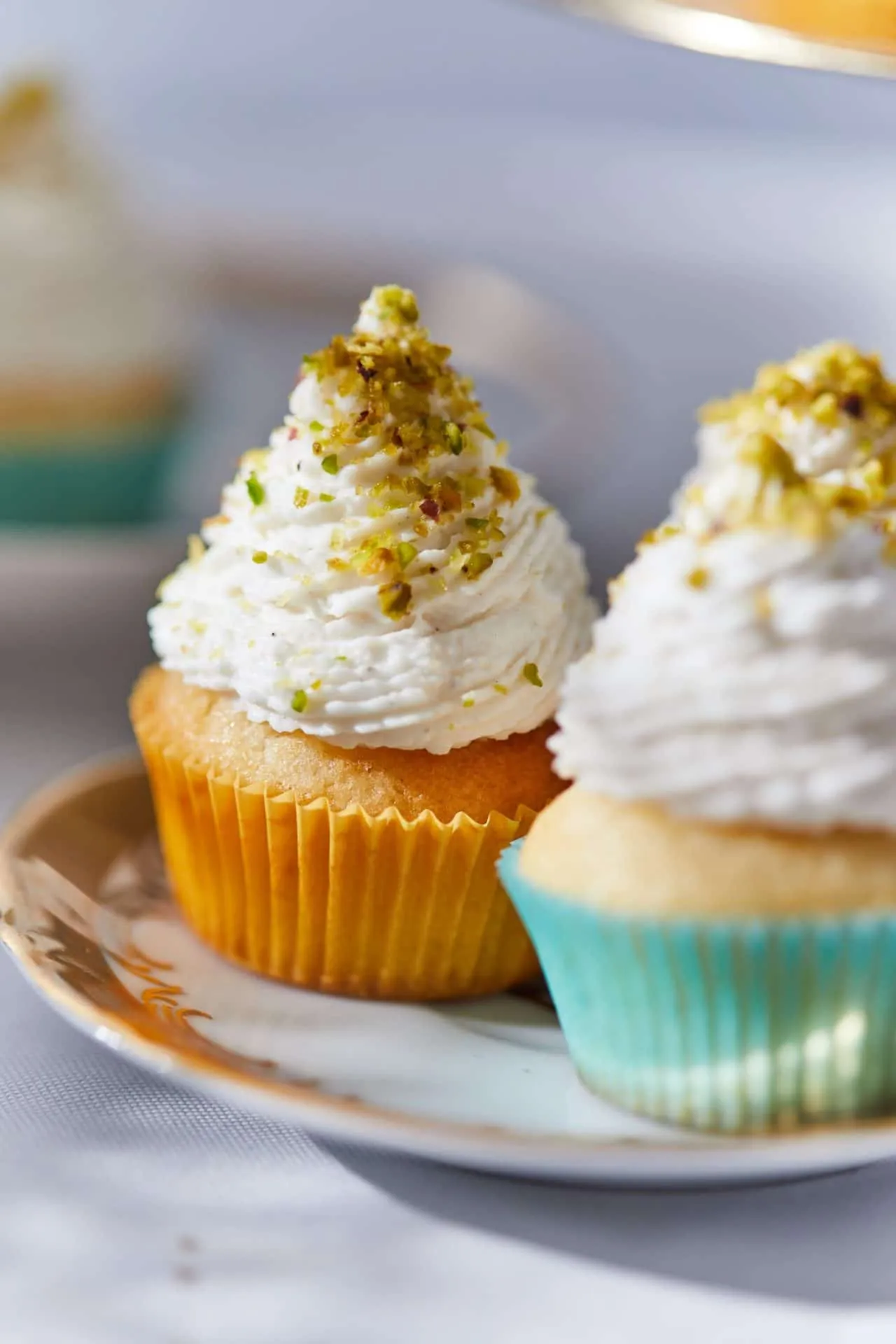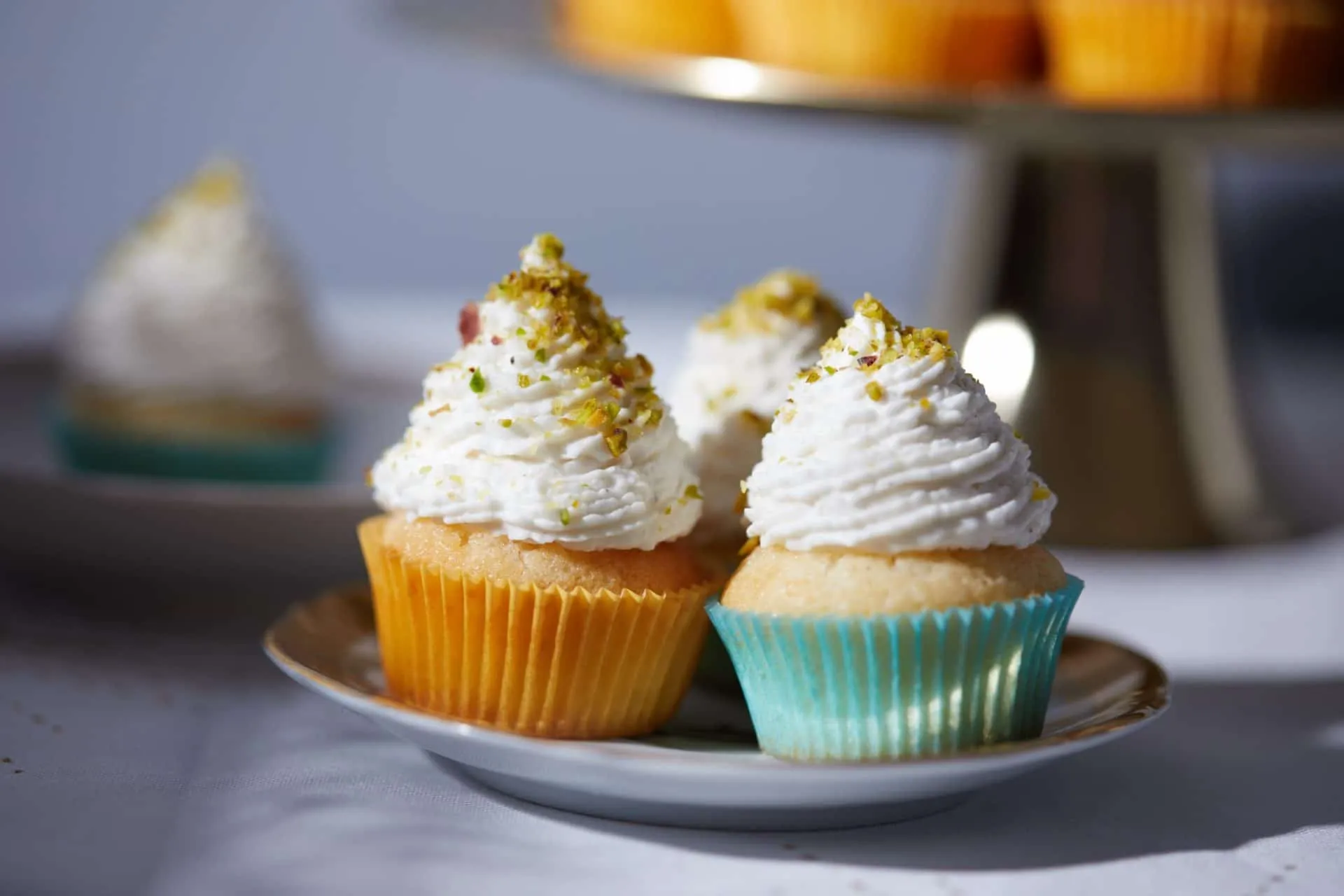 A mascarponét a porcukorral és a vaníliarúd kikapart magjaival stabil krémmé habosítjuk, majd belekeverjük a habverővel a pezsgőt. Csillagcsöves nyomózsákba töltjük a krémet, és kidíszítjük vele a muffinok tetejét. Végül megszórjuk apróra vágott pisztáciával.