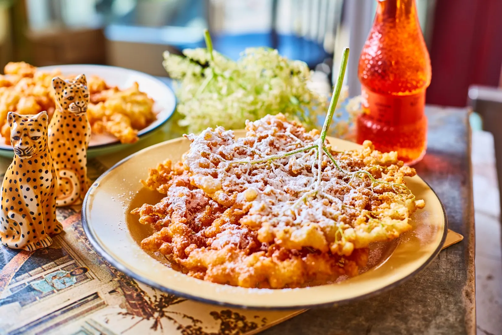 A pezsgős rántott bodzavirág igazi retró desszert! Első lépésként egy tálban összekeverjük a lisztet, a sütőport és a sót. Pezsgővel és felvert tojással simára keverjük a lisztes cuccot. Arra figyelünk, hogy könnyű palacsintatészta sűrűségű kell hogy legyen. 2,5 cm olajat öntünk egy serpenyőbe, 160 fokra melegítjük.