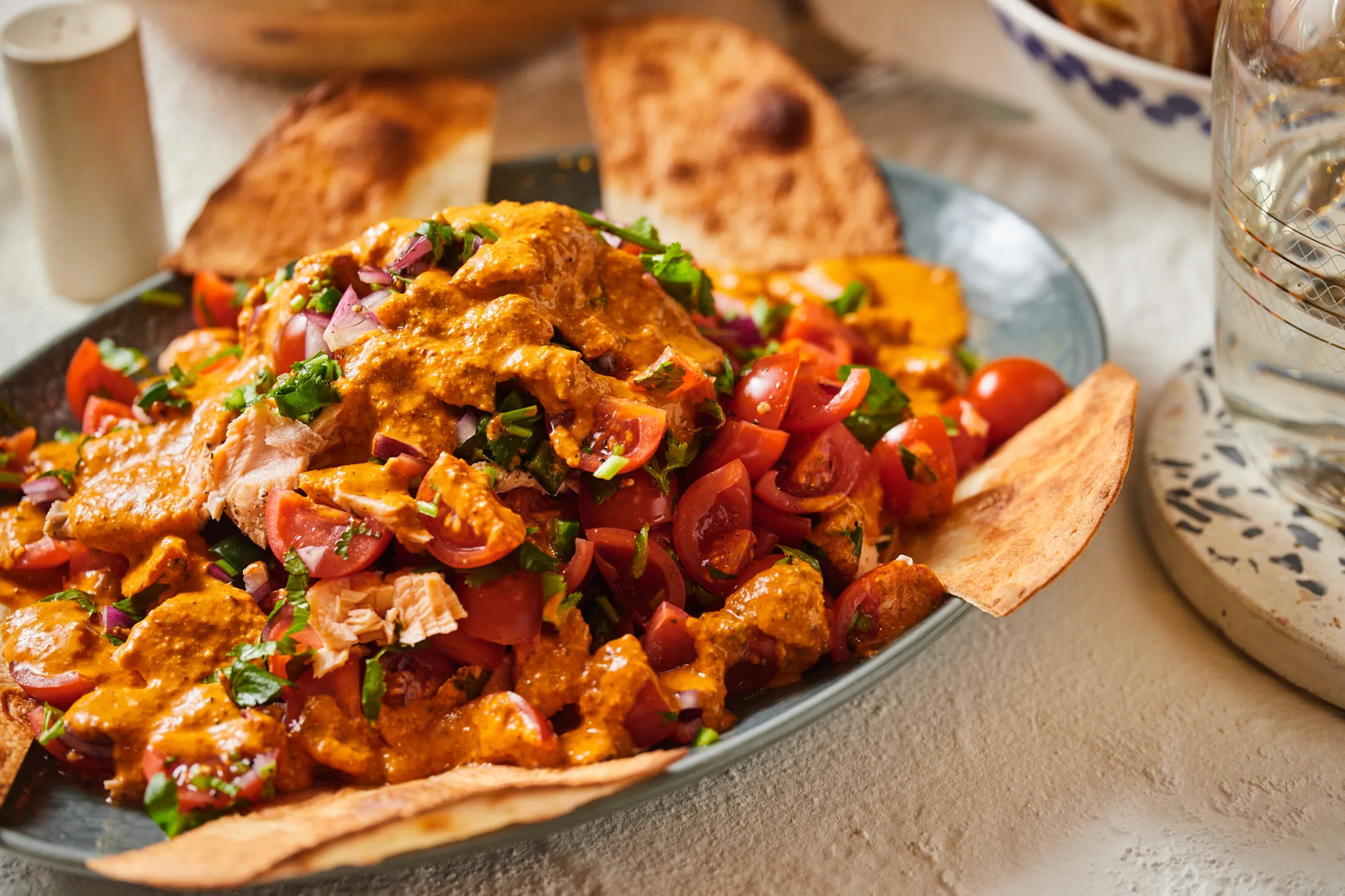 Tálalásnál a paradicsomos saláta felét egy lapoabb tálra halmozzuk és rátördeljük a kihűlt lazacot. Ráhalmozzuk a maradék paradicsomos keveréket és meglocsoljuk egy kevés kukoricaolajjal. Az egészet nyakon öntjük az öntettel, és pirított tortillával tálaljuk.
