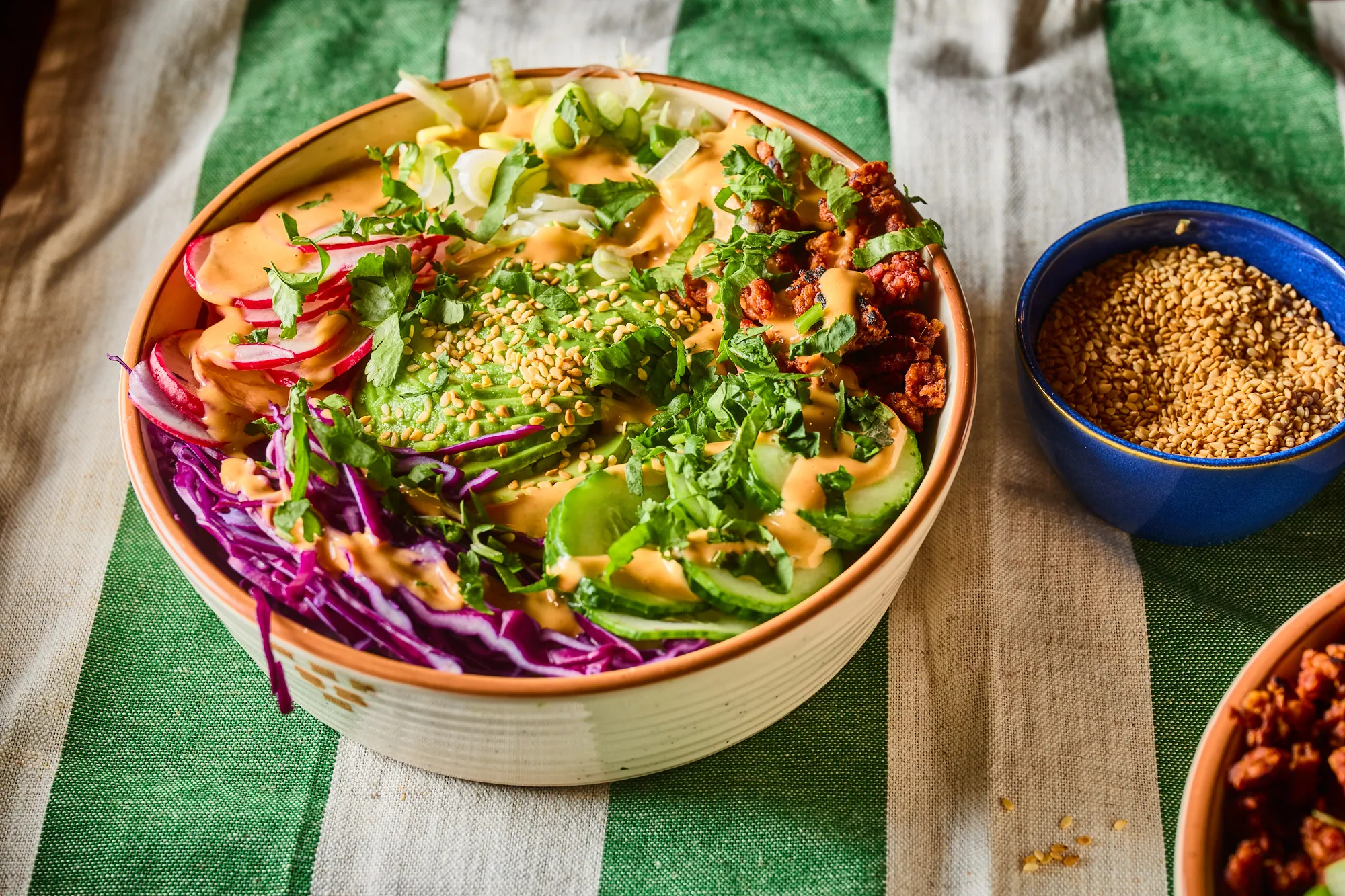 A főtt rizst a tál aljába kanalazzuk, erre tetszés szerint rápakoljuk a zöldségeket, a húshelyettesítőt és az avokádót. Bőségesen meglocsoljuk a pikáns szósszal, majd pirított szezámmaggal és friss korianderrel díszítjük tálalás előtt.