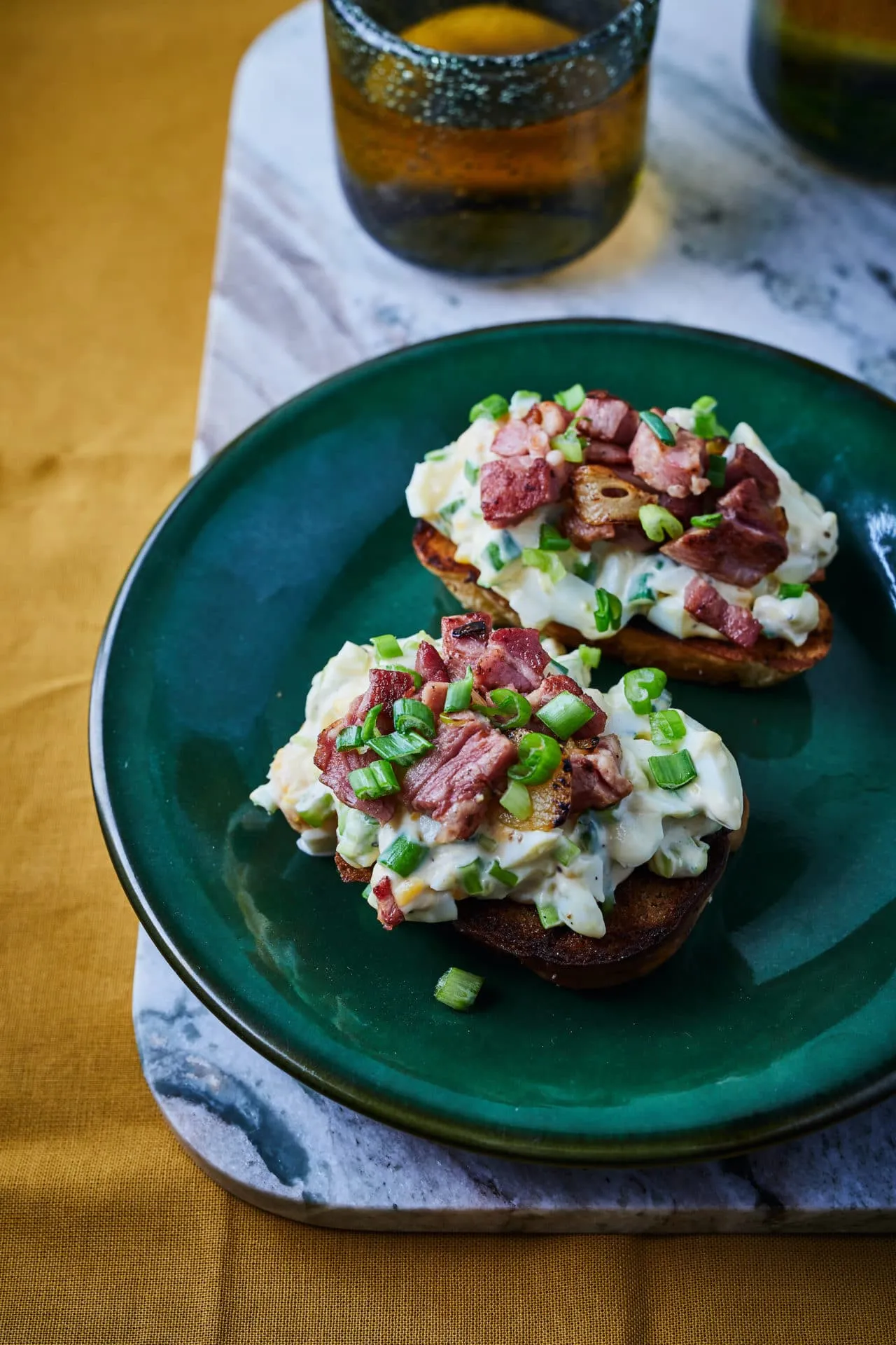 A tojásokat 10 perc alatt keményre főzzük, a sárgáját és a fehérjét külön tálba rakjuk. A sárgáját kikeverjük a tejföllel, a majonézzel, sóval, borssal, az apróra vágott újhagymával és citromlével, majd belekeverjük az apróra vágott fehérjét.
