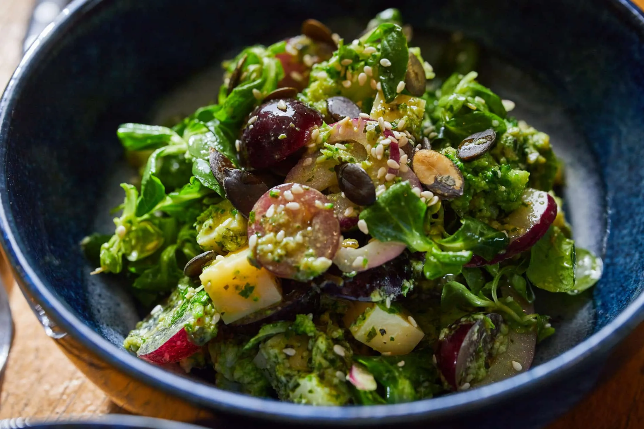 Az öntethez a bazsalikomleveleket, az olívaolajat, a majonézt, a lime reszelt héját és a felének a levét, a parmezánt és a tökmagot egy késes aprítóba rakjuk, sózzuk, borsozzuk, és alaposan lezúzzuk. Ha nem elég krémes, még olívaolajjal és kevés majonézzel hígíthatjuk. Ráöntjük a salátaalapra, összeforgatjuk, hogy mindent szépen bevonjon a krémes salátaöntet, és már ehetjük is!