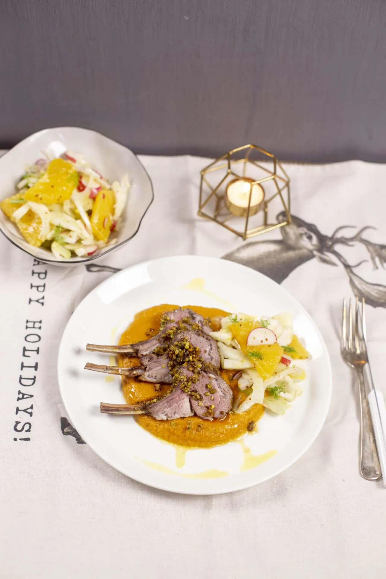 A salihoz a mustárt, az ecetet, az olajat, a sót és a borsot egy üvegben összerázzuk. A zöldségeket vékonyra szeleteljük (ha van, az édeskömény levelét megtartjuk), a narancs héját levágjuk, a fehér résszel együtt, és a narancs húsát is felszeleteljük, majd a salátára öntjük a dresszinget. Tálaláskor egy adag pürét teszünk a tányérra, rárakjuk a felszeletelt husit és mellé halmozzuk a salit is.