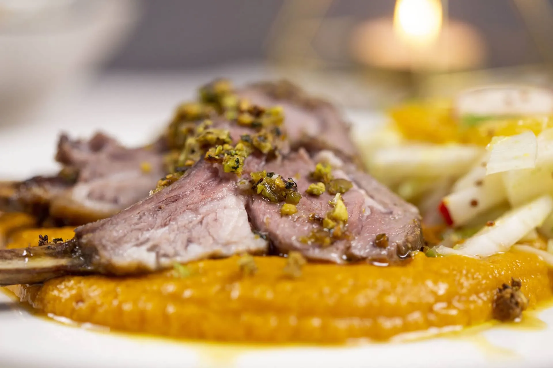 A bárányt sózzuk, borsozzuk, és egy kevés olajon elősütjük a serpenyőben, oldalanként 2-3 perc alatt. Lekenjük a mustárral. A pisztáciát, a panko morzsát, a fokhagymát, a bazsalikomot sóval, borssal egy aprítógépben lezúzzuk, majd ebbe forgatjuk bele a húst. Ha kell, kézzel segítünk rátapasztani. Egy sütőpapírral bélelt tepsire rakjuk, és 180 fokra előmelegített sütőben 12 percig, majd 200 fokon 10 percig sütjük. Ha jobban átsütve szeretitek, 180 fokon süssétek 15-20 percig, és utána 200 fokon tovább. Ha megsült, egy alufóliával letakarva hagyjuk állni 10 percig.