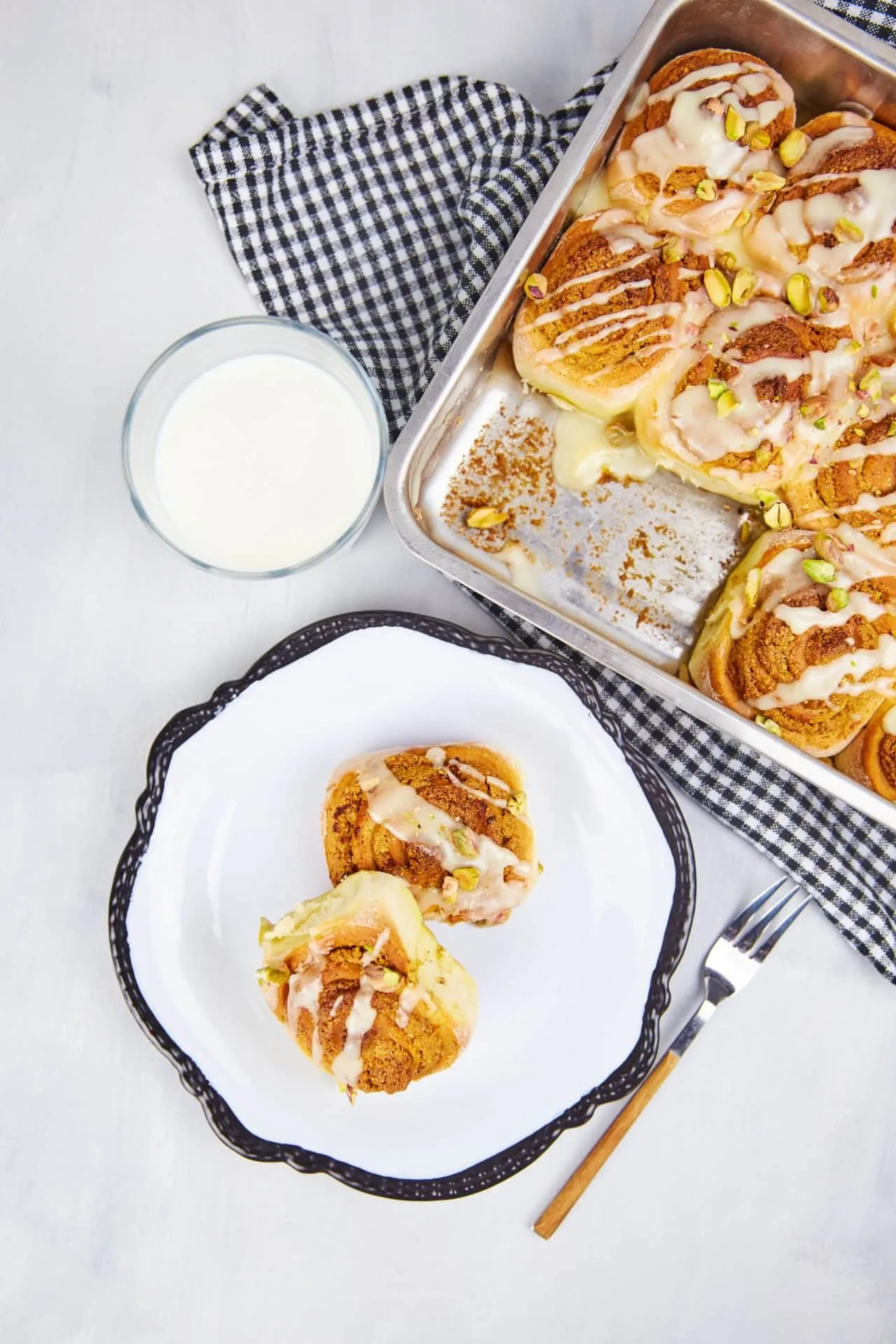 Közben a pisztáciát kissé lepirítjuk, majd még melegen lezúzzuk egy aprítóban. Hozzáadjuk a puha vajat és a cukrot, és még egyet zúzunk rajta, hogy szép krémet kapjunk. A tésztát lisztezett felületen téglalap alakúra nyújtjuk, megkenjük a pisztáciakrémmel, ráreszeljük a narancshéjat, és a hosszabbik oldalánál fogva feltekerjük, majd kb. 2 cm vastag szeletekre vágjuk. Az így kapott tekercseket sütőtálba rakosgatjuk, és hagyjuk 20 percet kelni. Ezután 175 fokra előmelegített sütőbe rakjuk a csigákat, és kb. 35 perc alatt készre sütjük.