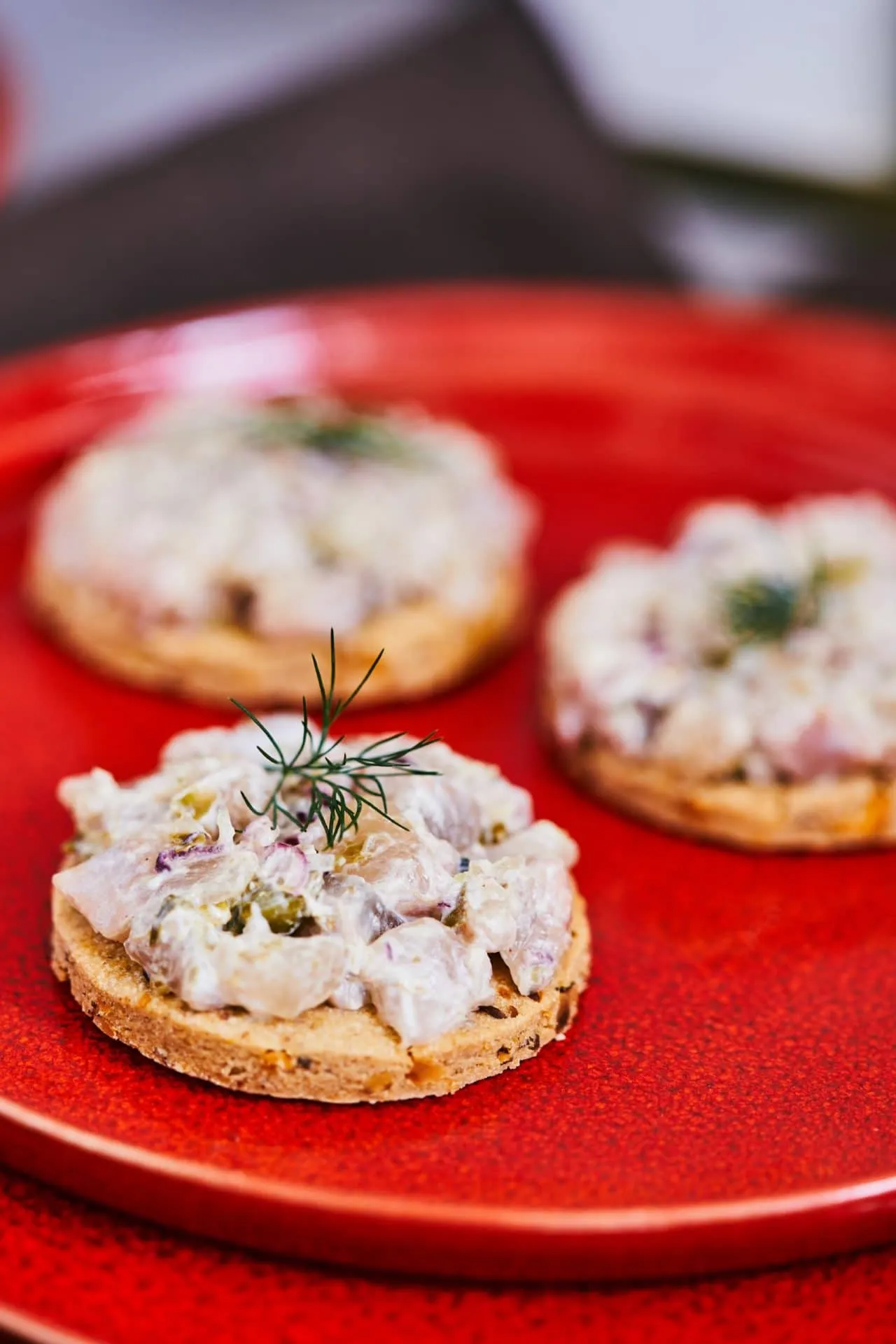 A halat lebőrözzük és apróra vágjuk a hagymával és a kapribogyóval együtt. A többi hozzávalóval jól összekeverjük, és legalább 3 órára hűtőbe tesszük.
