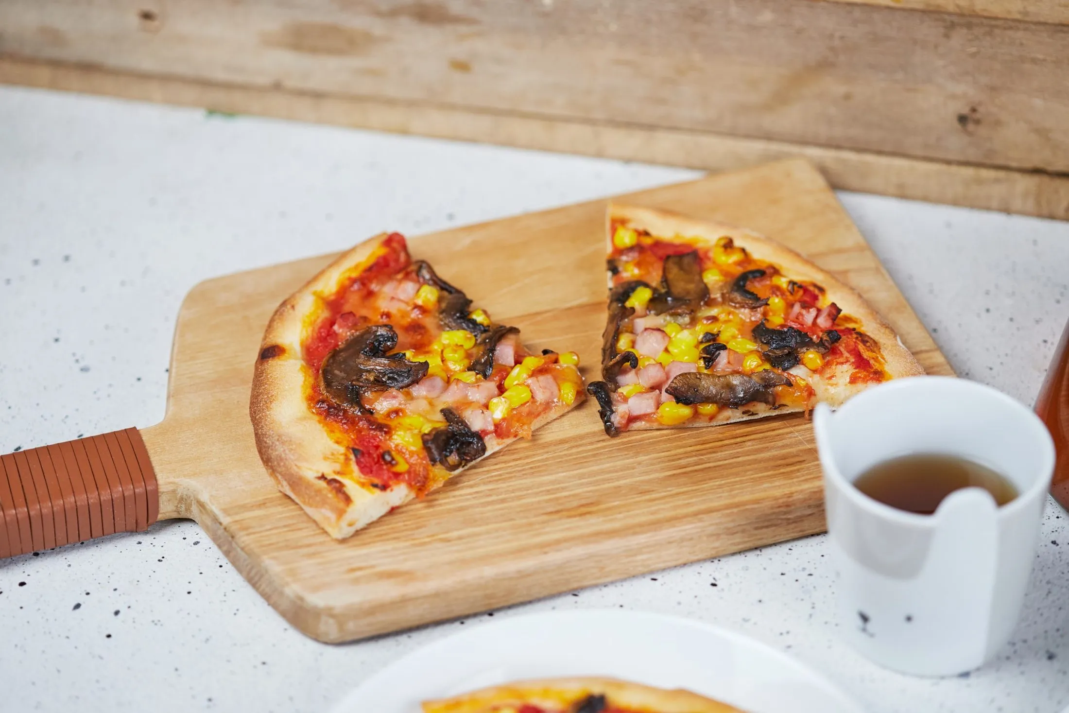 Enyhén lisztezett felületen kinyújtjuk a tésztát, sütőpapírra tesszük, majd megkenjük 2-4 evőkanál paradicsomszósszal, ezután jöhet rá a sajt. Megszórjuk kukoricával sonkával és gombával, majd meglocsoljuk egy kevés olívaolajjal. A sütőt előmelegítjük 230 fokra a tepsivel együtt, majd a tepsit kivesszük, és ráhúzzuk a pizzát a sütőpapírral együtt. Amilyen gyorsan tudjuk, betesszük a sütőbe, és 10-15 perc alatt készre sütjük.