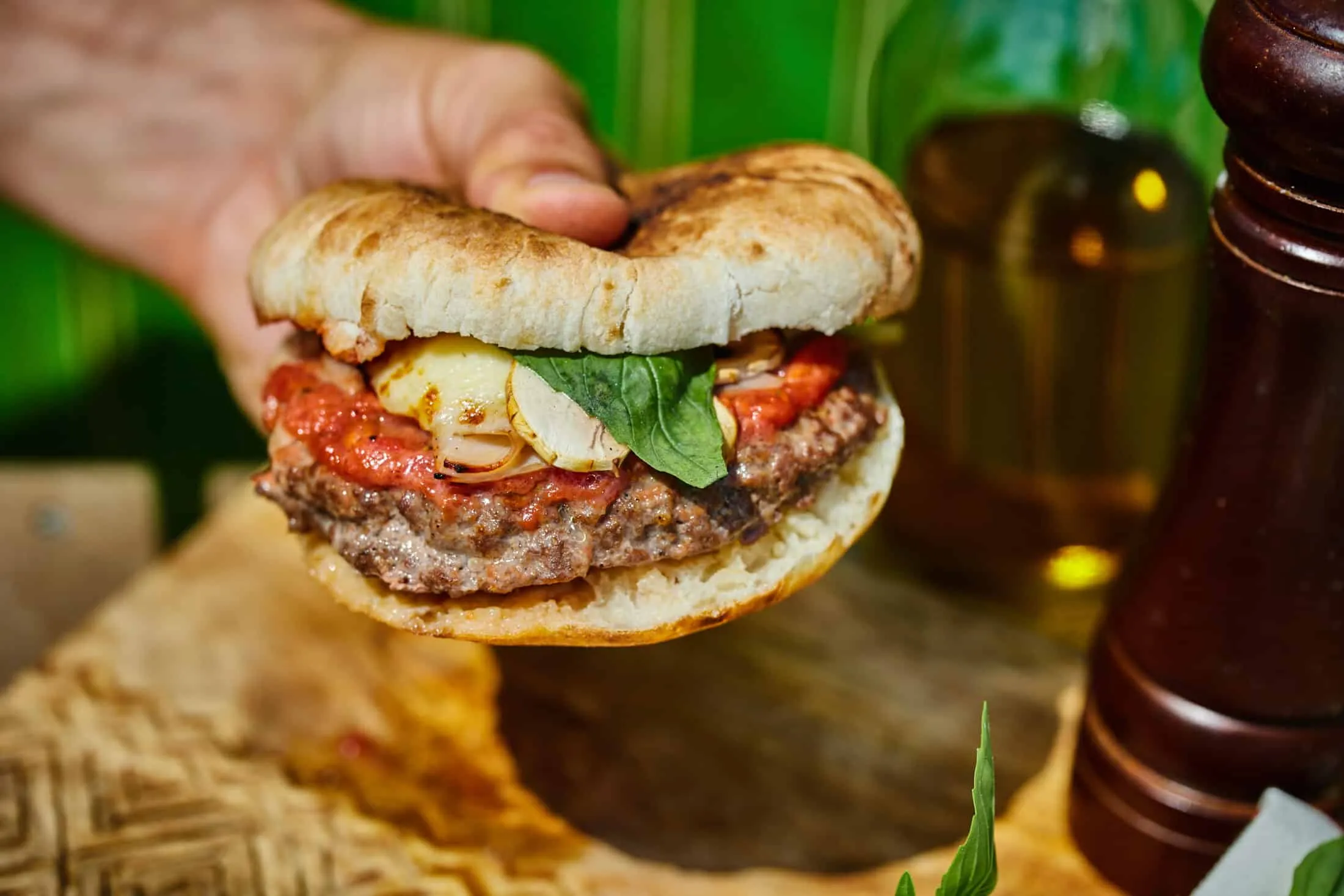 Az összeállításnál kettévágjuk a bucinkat, belerakjuk a mindennel megpakolt húspogácsát, dobunk a tetejére pár levél bazsalikomot, és lezárjuk a buci tetejével.