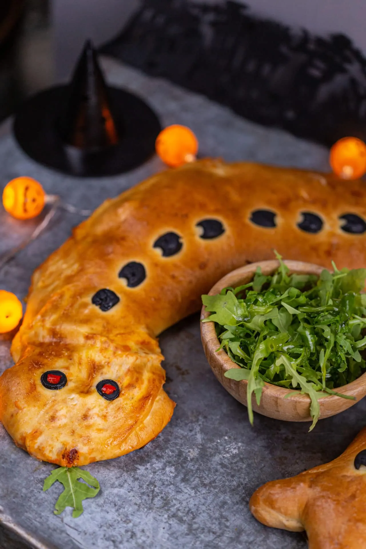 Ha megkelt a tészta, egy belisztezett nyújtódeszkán hosszirányban kinyújtjuk, majd a közepére halmozunk a töltelékből úgy, hogy a szélein maradjon szabad hely. Ott összezárjuk, alaposan megcsipkedjük, de vigyázva, hogy a töltelék ne jöjjön ki belőle. Megforgatjuk, hogy ez legyen az alja, és kígyózva beletesszük egy sütőpapírral bélelt tepsibe. és a tetejét lekenjük egy kevés vízzel felvert tojással. Félbevágott olajbogyókat pakolunk a hátára, és szemet is képzünk belőle. 190 fokra előmelegített sütőben 30 percig sütjük, amíg a teteje aranybarna nem lesz.