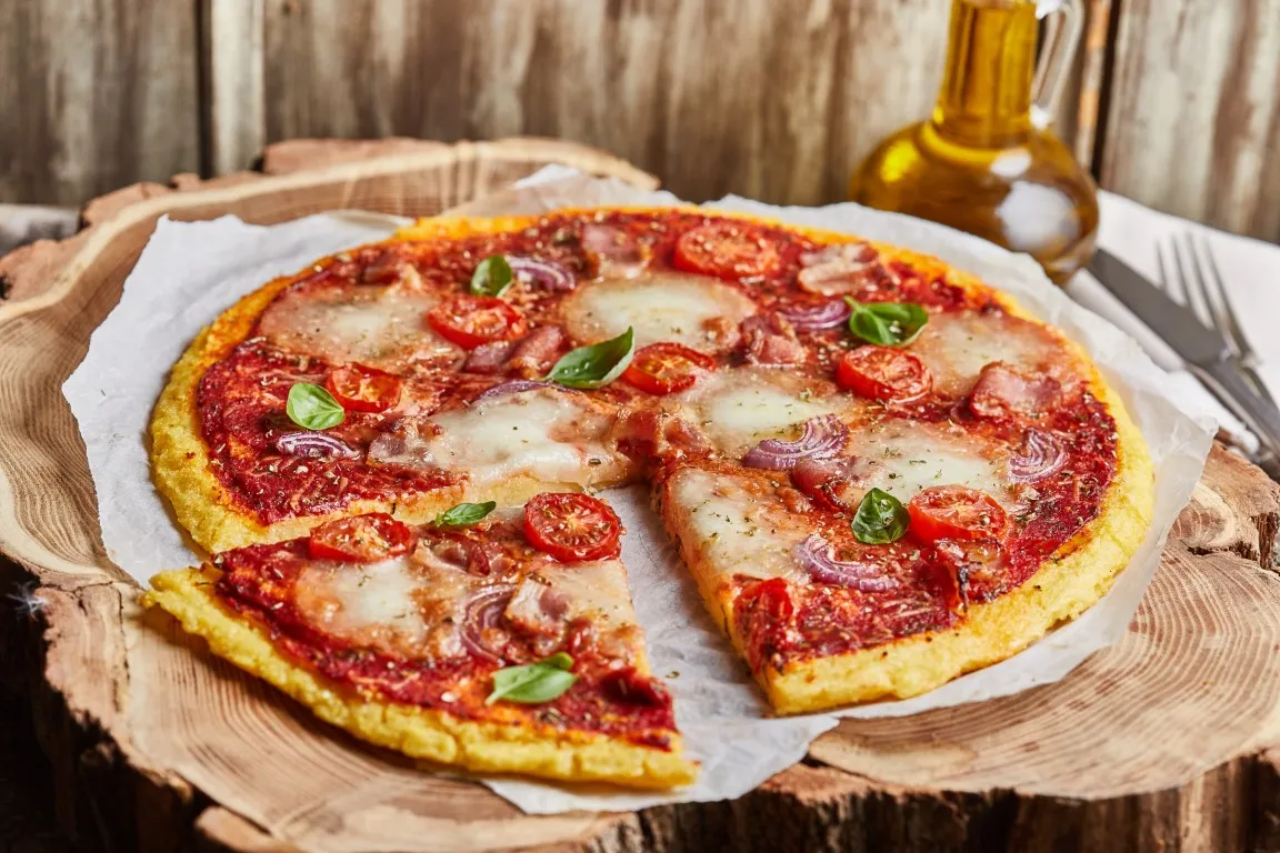 Miután kihűlt, a pizzaszósz hozzávalóit összekeverjük és rákenjük a pizzára. Ráreszeljük a parmezánt, rátépkedjük a mozzarellát, rápakoljuk az elfelezett paradicsomokat, a felszeletelt lilahagymát és a nagy kockákra vágott bacont. 230 fokra előmelegített sütőben addig sütjük, amíg egy kicsit meg nem pirul az egész. Ez kb. 20-25 perc. Miután kész, kivesszük, hagyjuk 10 percet állni. Megszórjuk oregánóval, pár levél friss bazsalikommal díszítjük és kész is. Felszeletelve tálaljuk.
