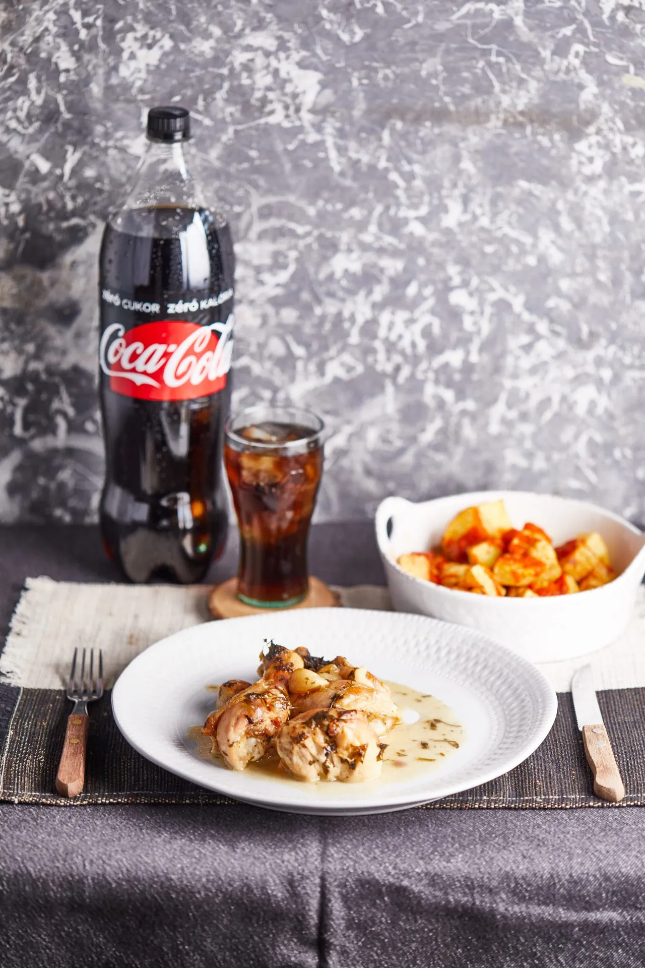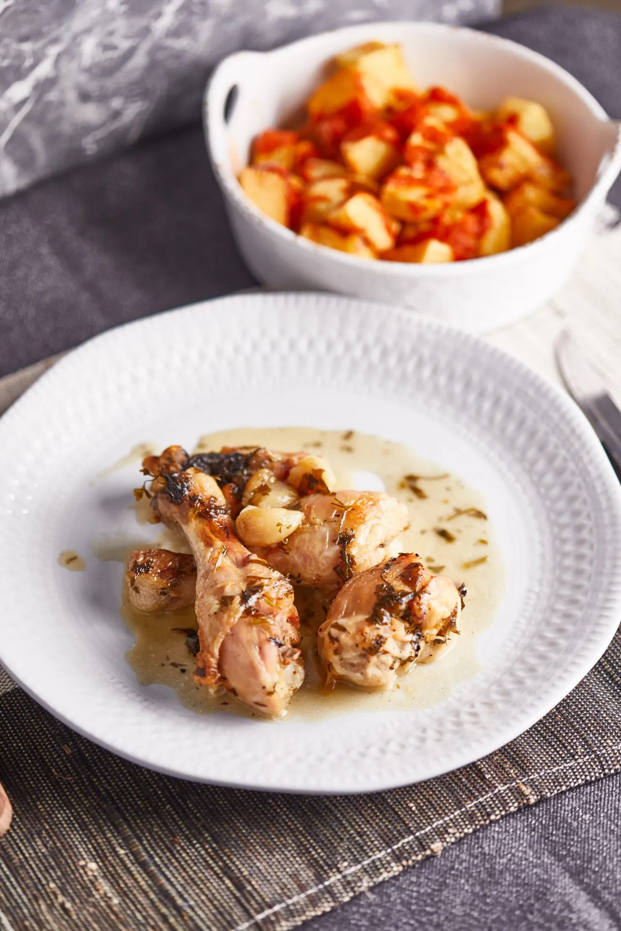 Olívaolajban alacsony hőfokon az apróra vágott hagymát megpirítjuk, hozzáadjuk az aprított fokhagymát is, sózzuk, borsozzuk. 5 perc után hozzáadjuk a pirospaprikát és a cayenne borsot. Jól elkeverjük és mehet bele a borecet és a paradicsompüré is. Nagyjából 5 perc főzés után rászórjuk a lisztet és elkeverjük, majd újabb néhány perc múlva felöntjük az alaplével. 5 perc rotyogtatás után az egészet leturmixoljuk. A krumplit meghámozzuk és közepes darabokra vágjuk, forró bő olajban kisütjük. A salsát ráöntjük a krumplira és a fokhagymás csirke mellé tálaljuk.