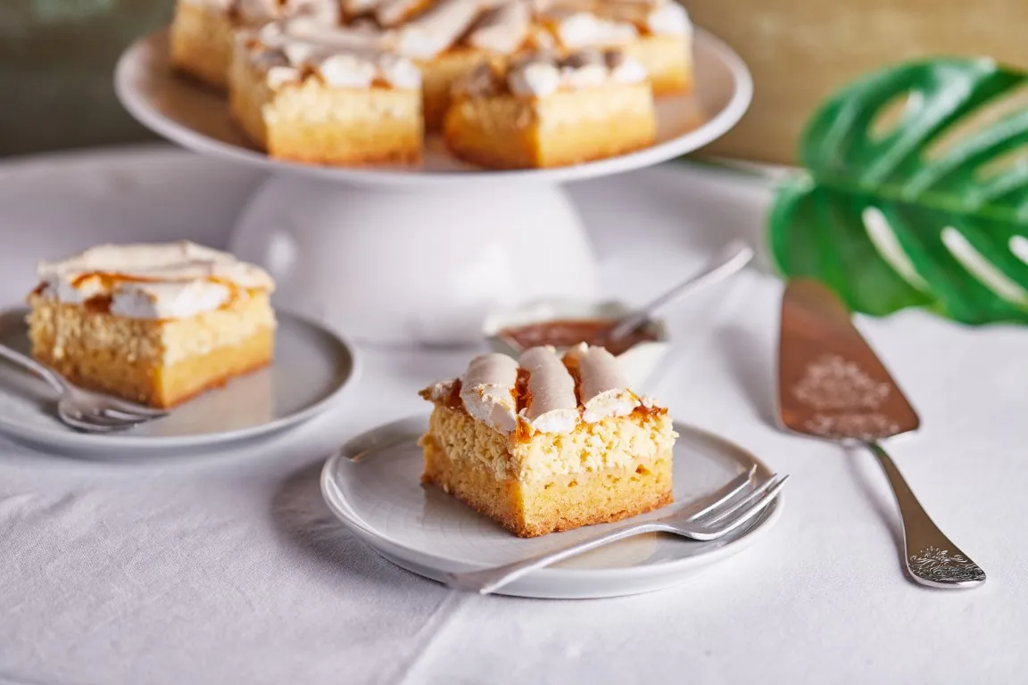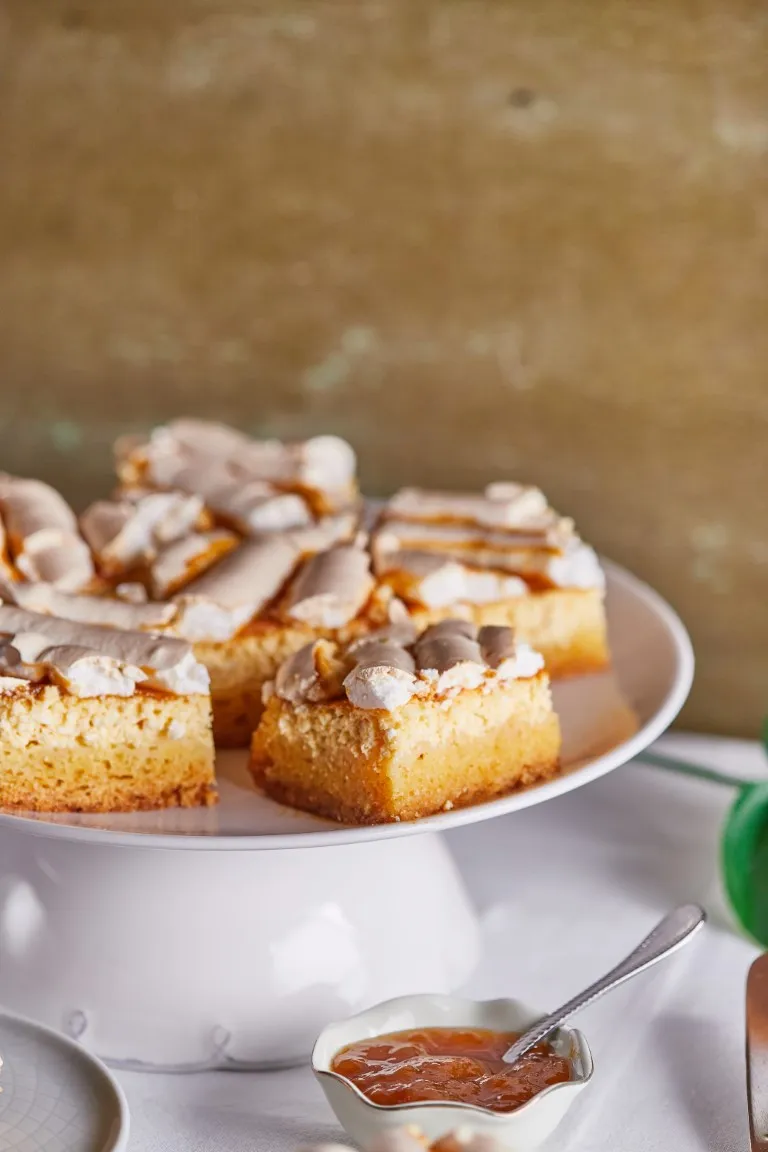 Az elősütött alapot megkenjük vékonyan baracklekvárral, és elsimítjuk rajta a túrós tölteléket. Visszatoljuk a sütőbe 25 percre. Közben a díszítéshez való tojásfehérjét a cukorral habbá verjük, nyomózsákba rakjuk, és mikor megsült a túrótöltelék is a sütin, sávokban rányomjuk a töltelék tetejére. A sávok közötti részeket kitöltjük baracklekvárral, és visszatoljuk a sütőbe kb. 8-10 percre.