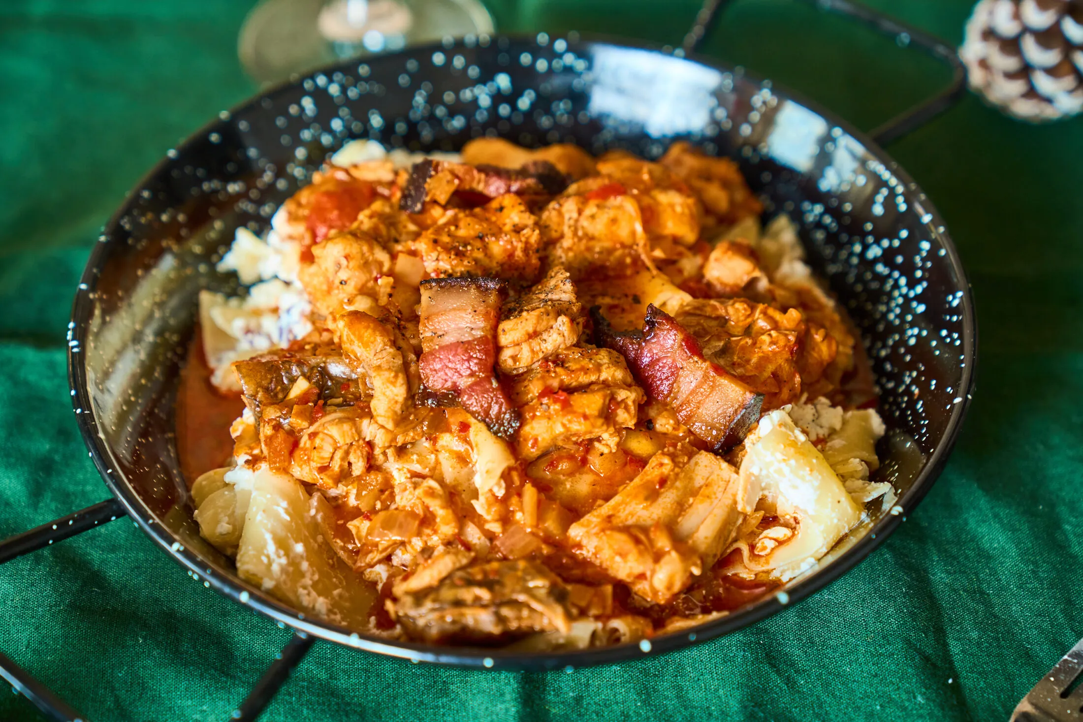 A pörköltet a túrós csuszával és a kolozsvári szalonnával tálaljuk, végül kicsit meglocsoljuk a szalonna zsírjával is, és ha csípősen szeretjük - szerintem úgy a tuti -, ízlésünk szerint belenyomjuk a benne főtt chilipaprikát is.