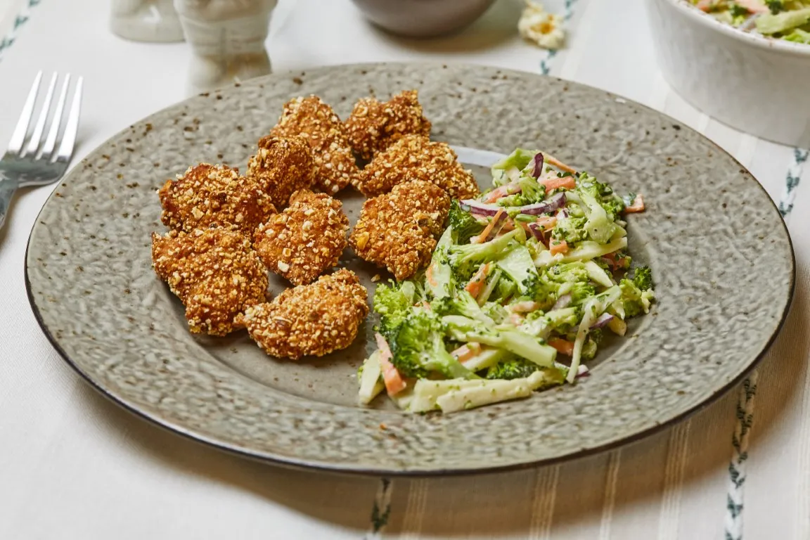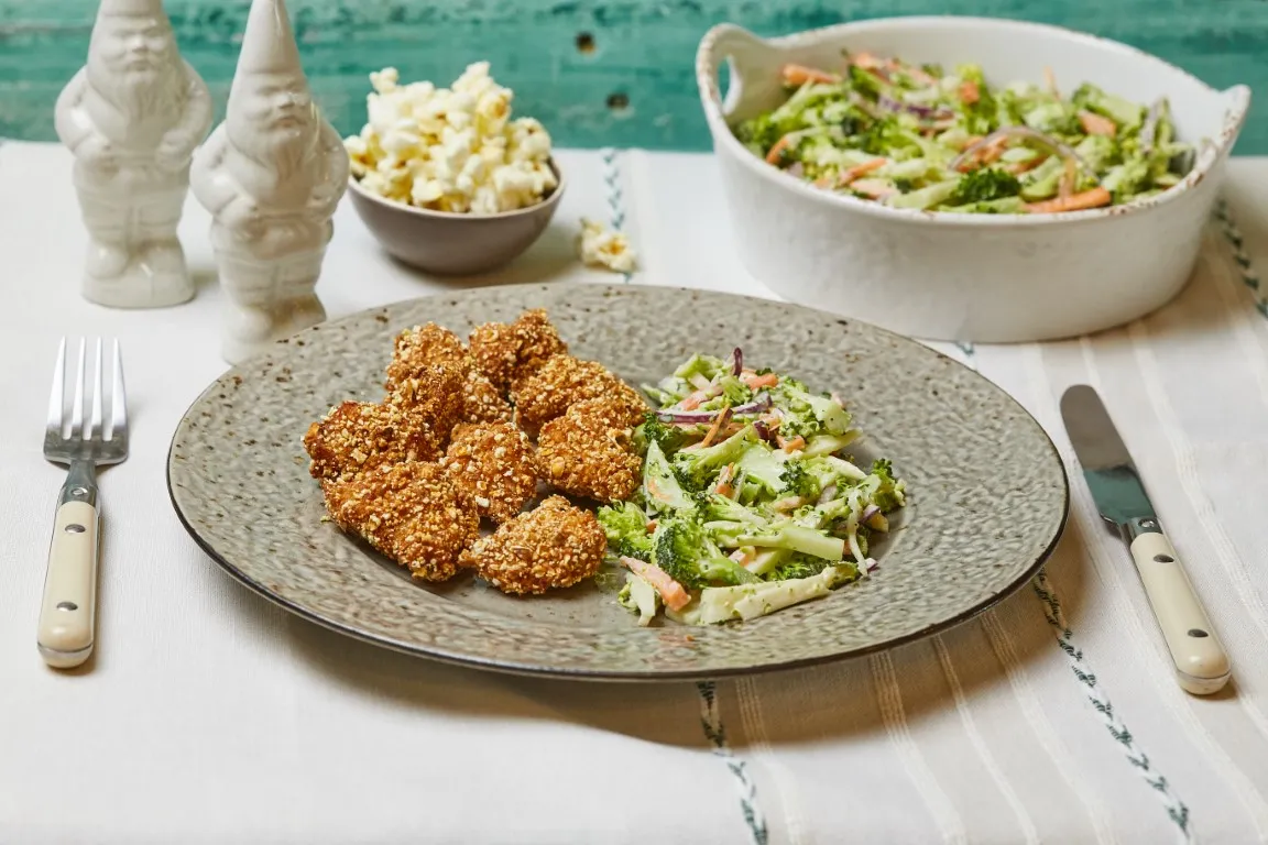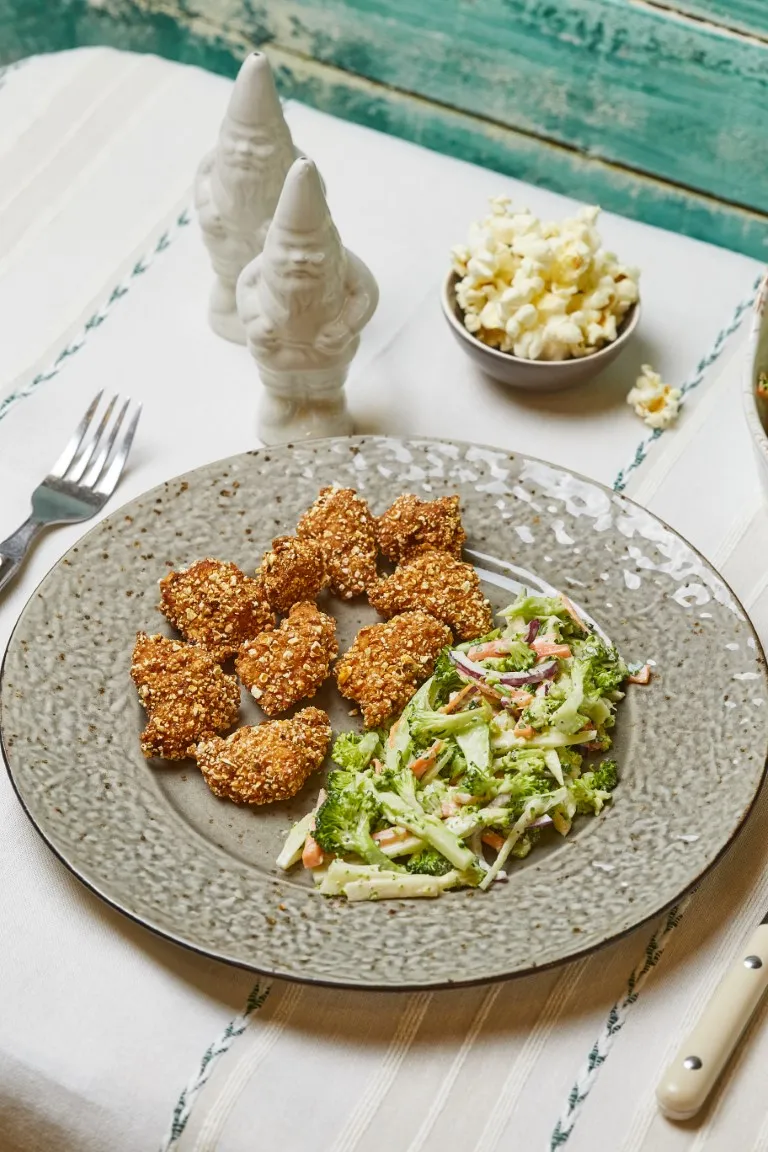 Bár viccként merült fel, de mi lenne, ha sima popcorn helyett, egyszer a moziban, popcorn-bundás csirkét ennétek? :D Amúgy iszonyú ropogós lett, és a brokkoli slaw pedig totálisan feldobta (vagy vitálisan?!). :D