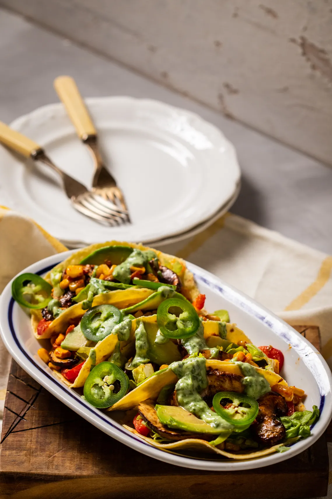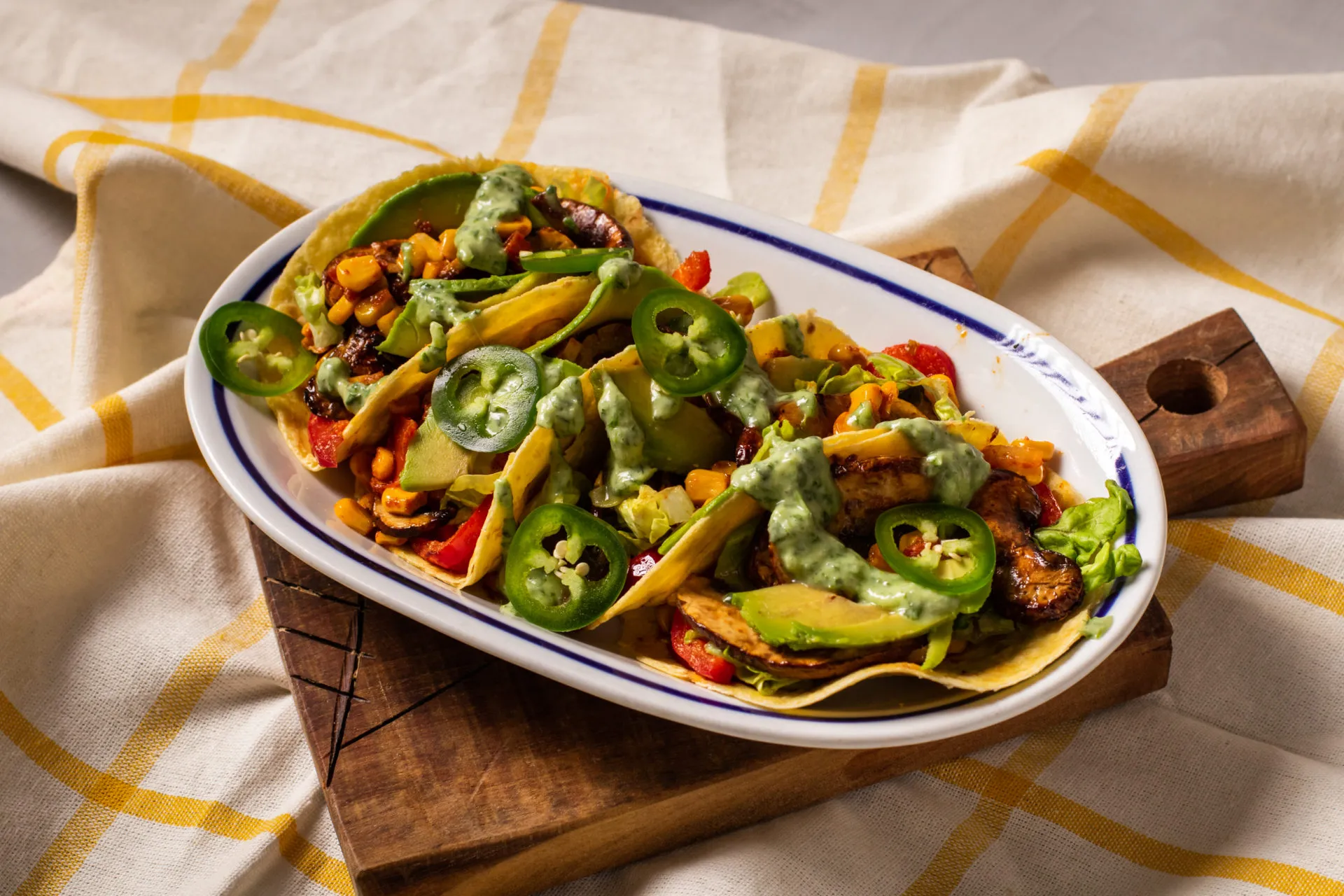 A szósz összetevőit késes aprítóban krémes állagúra zúzzuk, a salátát pedig vékony csíkokra vágjuk. Tálalásnál a tacot közepére teszünk egy kanál kukoricás-paprikás mixet, néhány szelet gombát és avokádót, salátát, és a végén meglocsoljuk a szósszal.