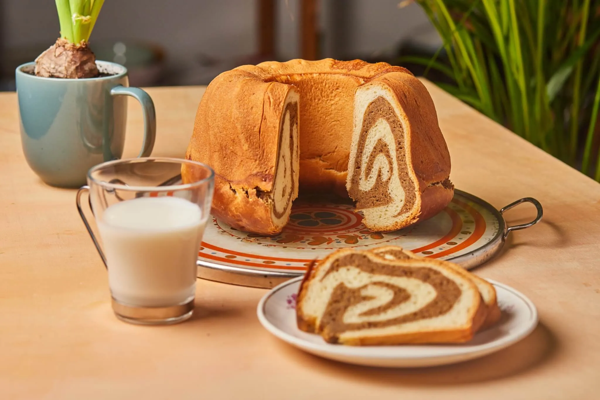 A tésztát lisztezett felületen fél centi vastag, nagy téglalappá, kb. 40 x 30 cm-esre nyújtjuk. Elkenjük rajta a diós masszát úgy, hogy a végein és a szélein 1-2 cm-t üresen hagyunk. Az alsó oldalától indulva szorosan feltekerjük, majd egy kivajazott kuglófformába hajtjuk úgy, hogy a hajtás a tetején legyen. 170 fokra előmelegített sütőben 50-55 perc alatt készre sütjük, tűpróbával ellenőrizzük. A kész kalácsot kiborítjuk a formából, és így hagyjuk kihűlni.