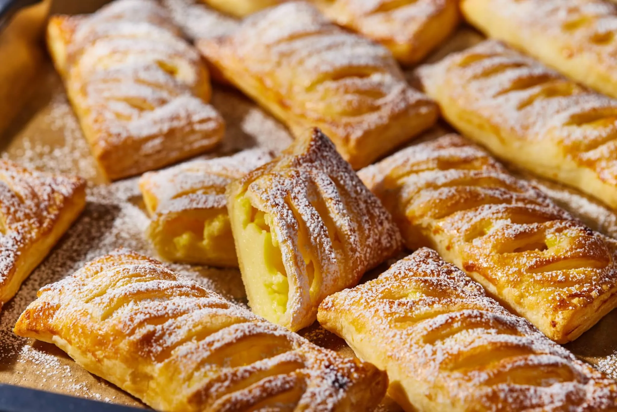 A leveles tésztákat kihajtogatjuk, hosszában, középen kettévágjuk, majd széltében 3 részre, így egy lapból 6 db négyzetet kapunk. Lekenjük vékonyan a széleket a felvert tojással, és az egyik felükre rakunk egy-egy adag pudingot. A maradék részt egy éles késsel bevagdossuk, majd ráhajtjuk a pudingos részre, és egy villával vagy kés élével lenyomkodjuk, hogy tuti ne nyíljon ki a sütés során.