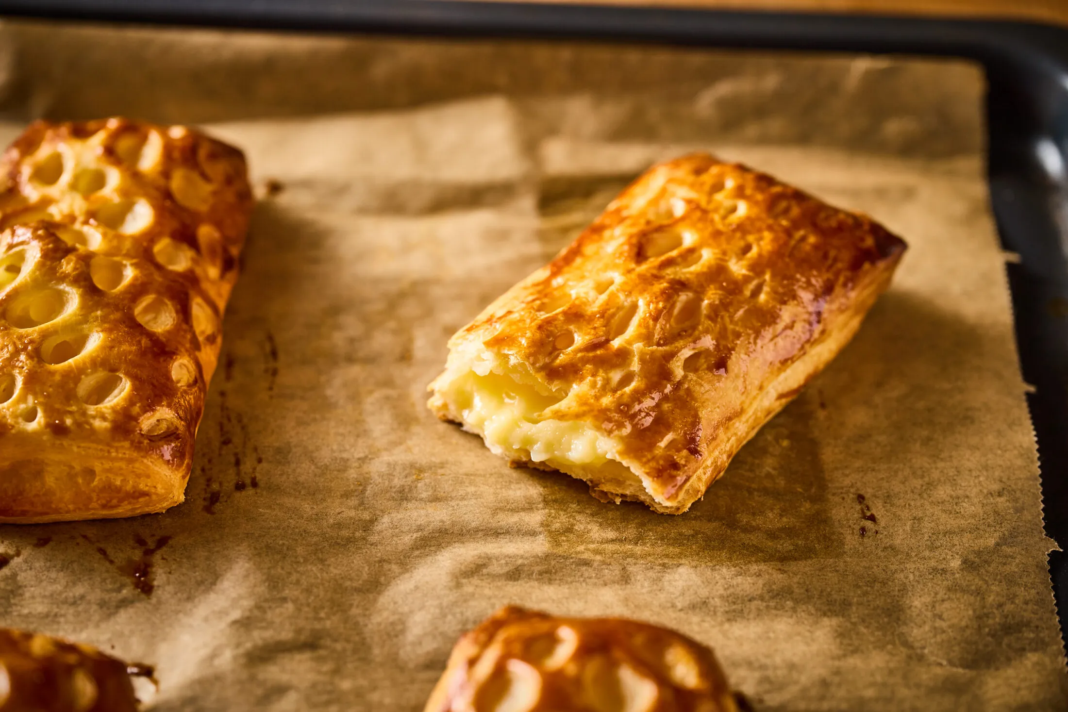 A tölteléket a 12 cm széles téglalapok egyik felére helyezzük, illetve az egyik keskeny téglalapra. A fennmaradó tésztarészeket sűrűn bevagdossuk. A tojást kettéválasztjuk, a fehérjével körbekenjük a tésztaszéleket, és ide áthajtjuk a bevagdosott darabokat. Lenyomkodjuk az oldalakat, a keskeny téglalapot pedig a pudingos rész tetejére rakjuk, és szintén lenyomkodjuk az oldalait.