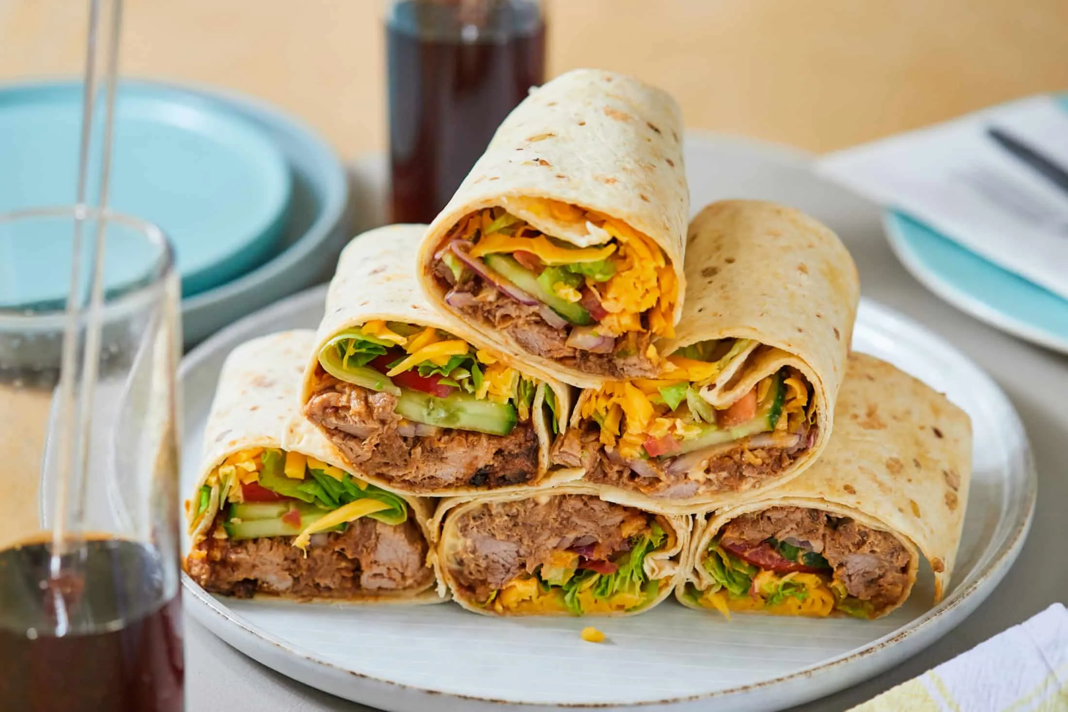 A felmelegített tortillalapok alját megkenjük majonézzel, BBQ-szósszal, rárakjuk a húst, a vékonyra szeletelt lila hagymát, az uborkát, a paradicsomot, a jégsalátát és a reszelt sajtot, feltekerjük és meg is vagyunk.