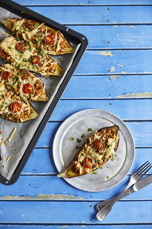 A padlizsán húsát kivájjuk és kockákra vágva, olívaolajon 4-5 perc alatt lepirítjuk – ha felszívta az olajat, újabb adagot adunk hozzá. Ezután félretesszük egy itatóspapírral bélelt tányérra. A hagymát üvegesre pároljuk, majd hozzáadjuk a bacont, a sárgarépát, az angol zellert, majd a fokhagymát is. Hozzáadjuk a pulykahúst és hagyjuk, hogy kicsit lepiruljon, hozzáöntjük a paradicsompürét és a vizet, majd a fűszerekkel ízesítjük. 20 percig főzzük. Hozzáadjuk a bulgurt és további 10 percig főzzük. Legvégül pedig beleforgatjuk a lepirított padlizsánt és beletépkedjük a friss bazsalikomot is. A padlizsánok belsejét sózzuk, borsozzuk, majd sóval és kb 0,5 dl olívaolajjal összetörünk 3-4 gerezd fokhagymát egy mozsárban és ezzel is bekenjük. Betöltjük a ragut, a tetejét megszórjuk reszelt sajttal és 180 fokon kb 20 perc alatt megsütjük.