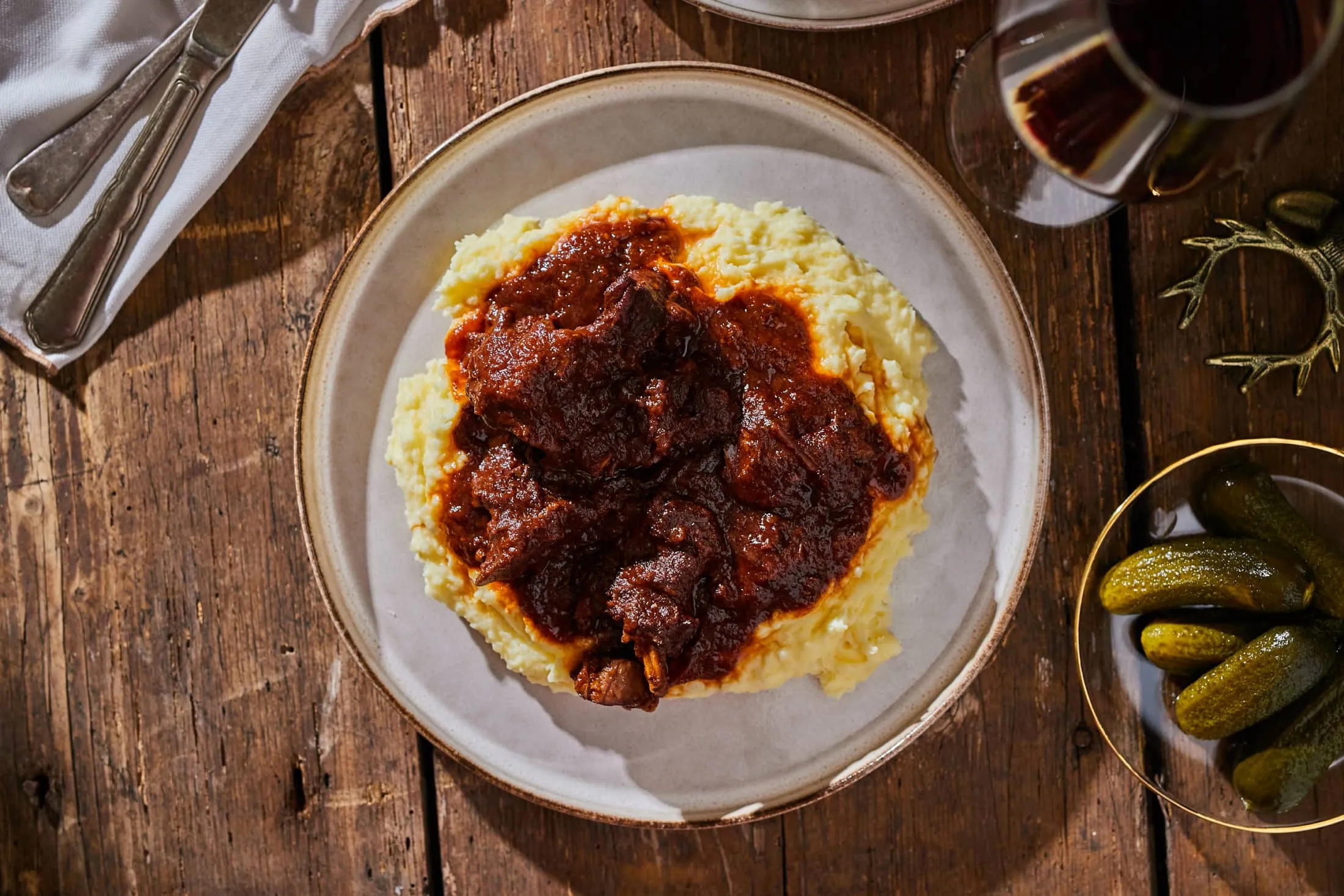 A legvégén felöntjük a vörösborral és további 5 perc főzés után lekapcsoljuk a tűzhelyet. Krumplipürével tálaljuk.