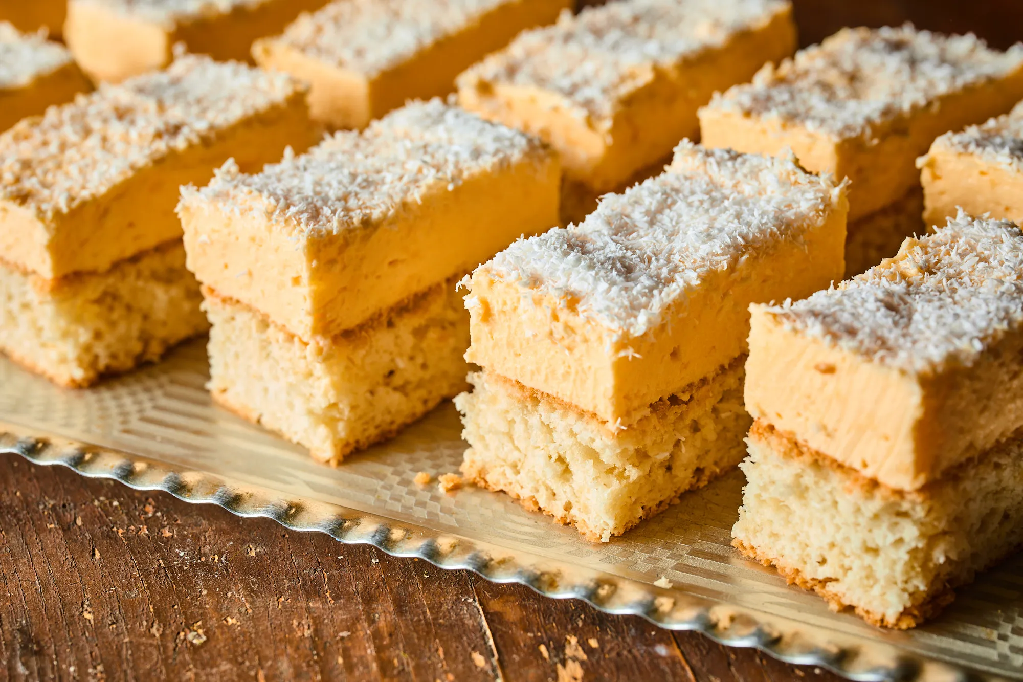 Bár a hosszú pihentetési idő próbára teszi a türelmet, ez a kókuszos süti tényleg akkor a legfinomabb, amikor a hűtőben a krém és a tészta kellőképpen összeért. A tetejére szórt bőséges kókuszreszelék nemcsak a névadó édességet idézi, hanem selymes bevonatot is ad a vaníliás rétegnek. Tálalás előtt vágd fel szeletekre, és ha igazán ünnepivé tennéd, díszítsd minden kocka tetejét egy szem egész mandulával vagy egy félbevágott kókuszgolyóval.
