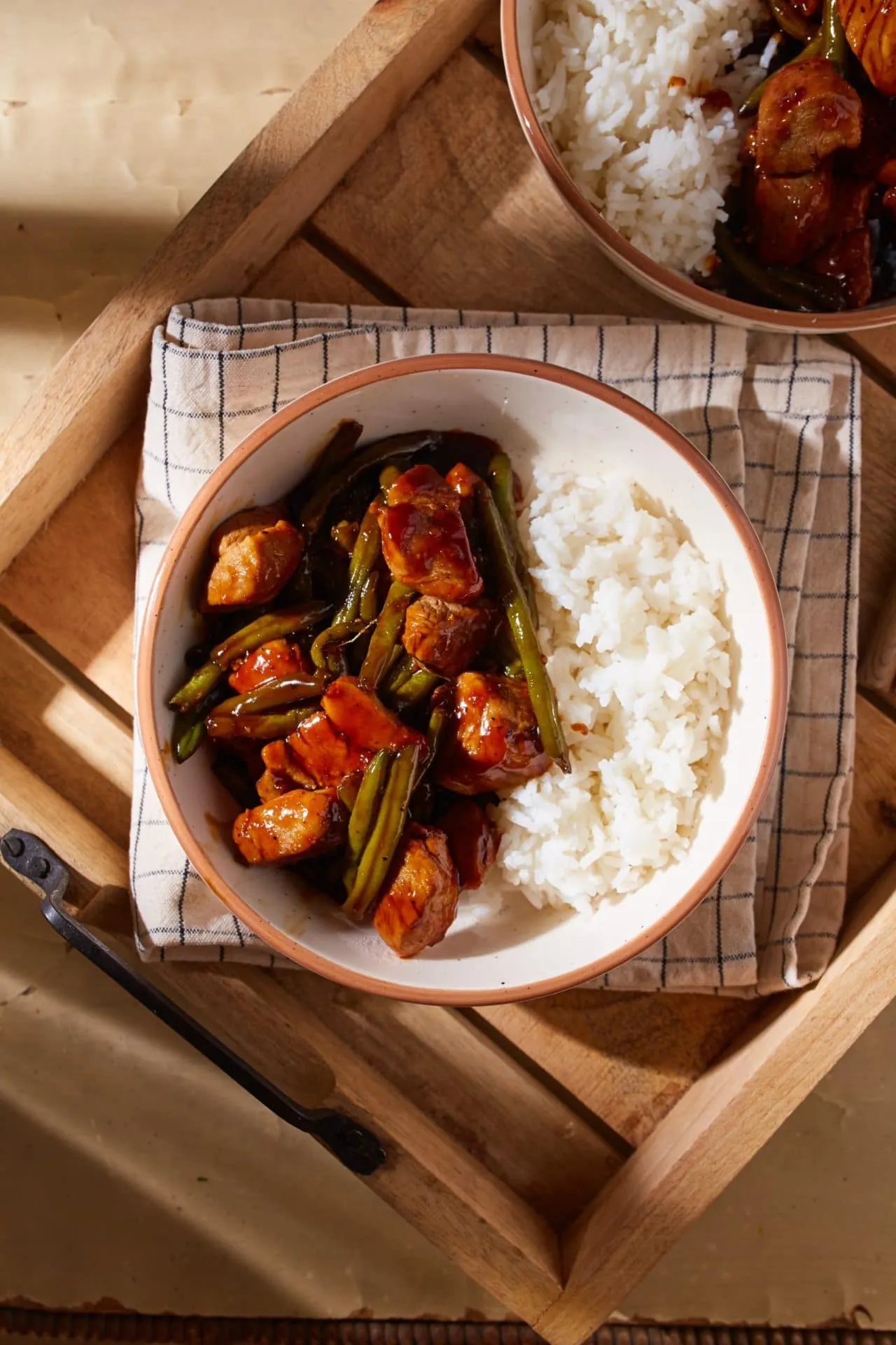 A húst nagyobb kockákra vágjuk, sózzuk, borsozzuk, és egy nagyobb serpenyőben hirtelen megpirítjuk az olajon, majd kiszedjük. A visszamaradt szafton 2-3 percig lassú tűzön megpirítjuk a babot, rányomjuk a fokhagymát, a gyömbért, majd visszarakjuk a húst, és pár percet pirítjuk. A máz hozzávalóit összekeverjük egy tálban, és ráöntjük a húsra. 2-3 percet forraljuk, és főtt rizzsel tálaljuk.