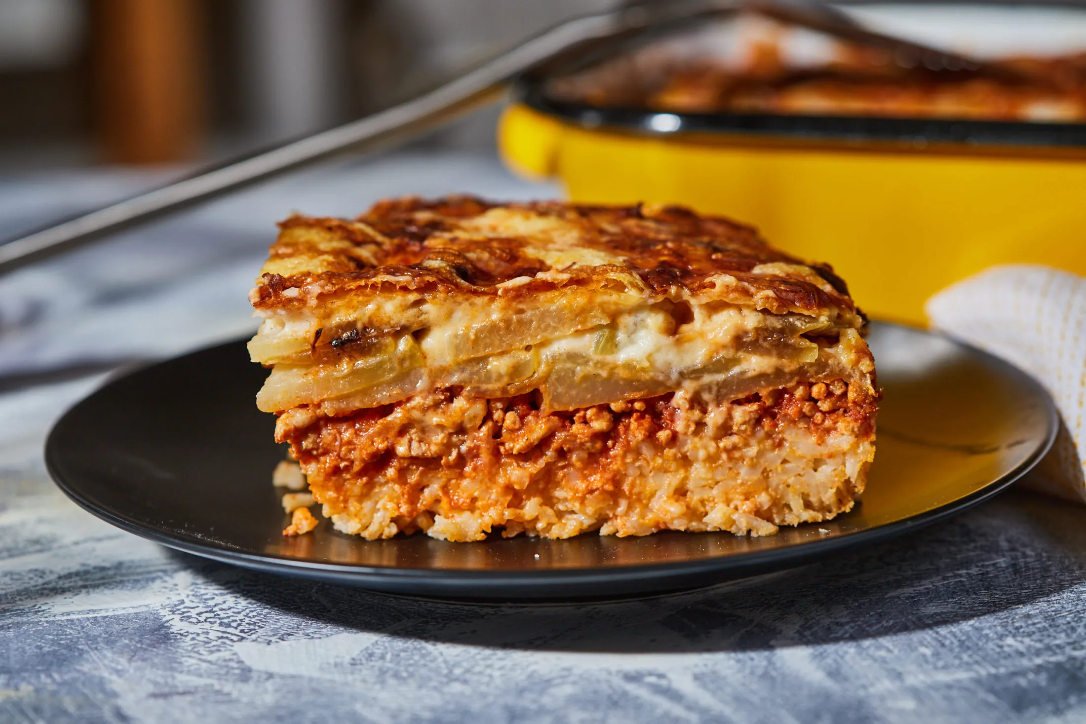 Egy kivajazott tepsi aljára rakjuk a rizst, erre jöhet a húsos ragu, a sült karalábé, a besamel és végül a reszelt sajt. 180 fokra előmelegített sütőben 35-40 perc alatt megsütjük. Tálalás előtt hagyjuk állni 15 percig, aztán eshetünk is neki.