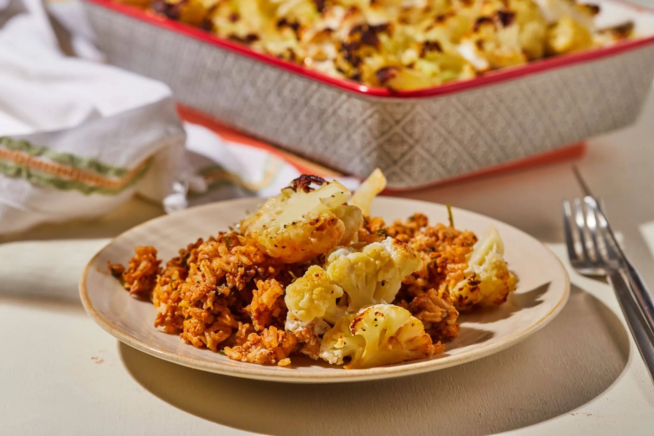 A rizses keveréket egy 25 x 35 cm-es tepsibe tesszük, ráhelyezzük a karfiolt, majd rákanalazzuk a joghurtot. 200 fokra előmelegített sütőben kb. 30 percig sütjük.