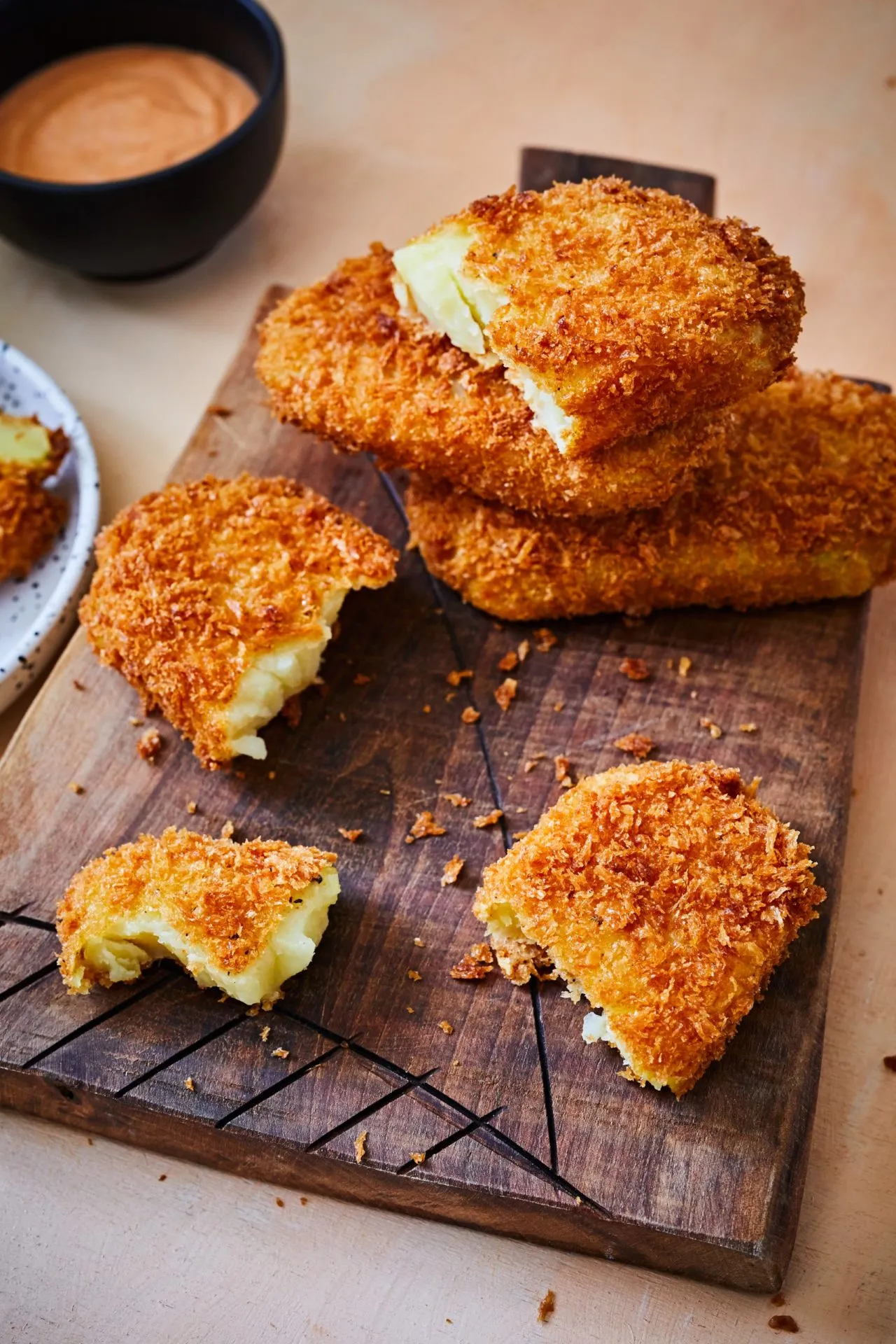 A burgonyát meghámozzuk, 1-1,5 cm vastagságú szeleteket vágunk belőle, majd sós, gyöngyöző vízben puhára főzzük – de vigyázzunk hogy ne essen szét. Ezután kivesszük a vízből, és kihűtjük. A szokásos módon, lisztbe, tojásba, majd kenyérmorzsába forgatjuk, és bő, forró olajban aranybarnára sütjük. A majonézt és a sriracha szószt összekeverjük, és ezzel a mártogatóssal tálaljuk a krumplit.