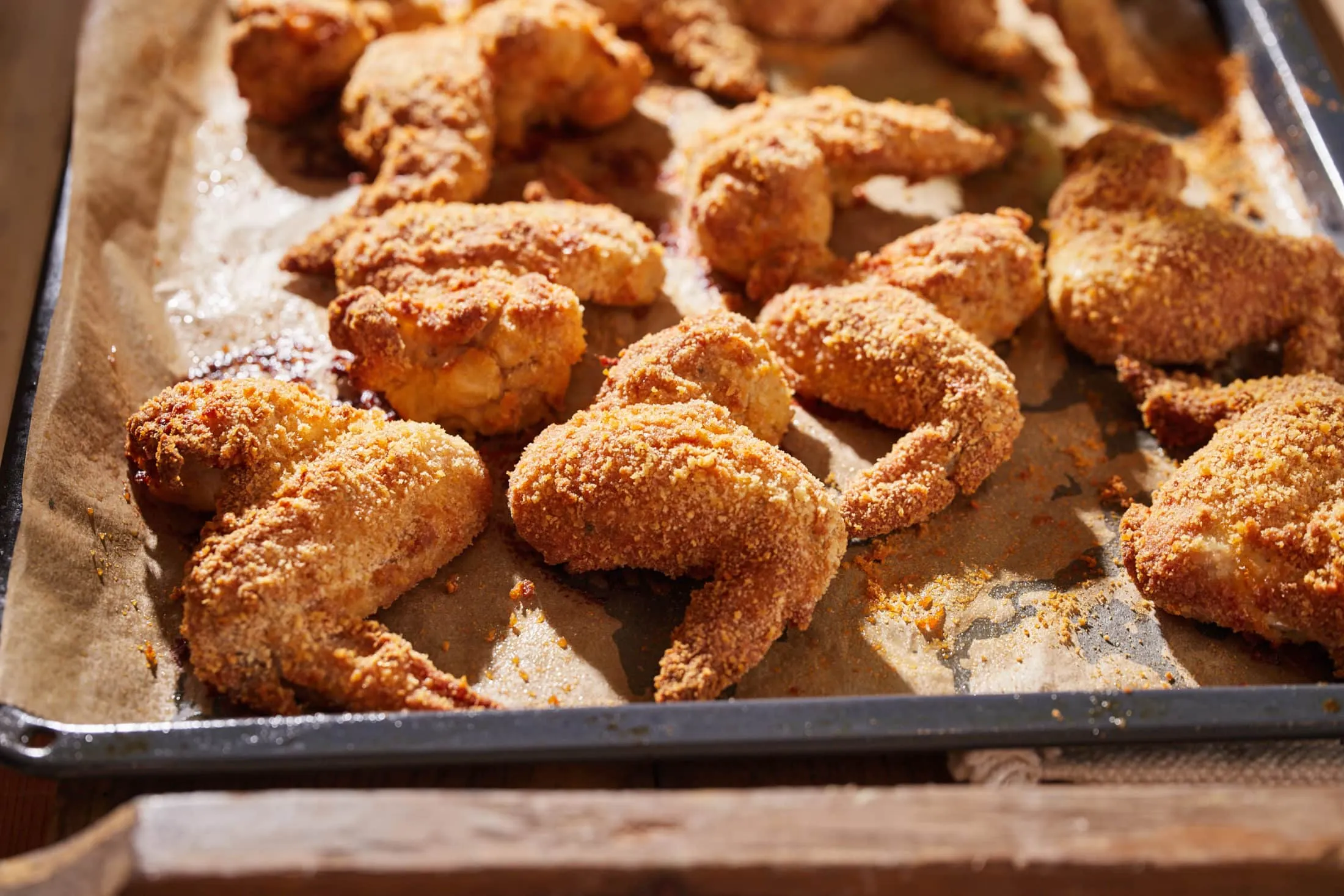 Sütőpapírral borított tepsire pakoljuk a szárnyakat, olajos ecsettel kissé átkenjük őket, és 180 fokos sütőben 45-50 perc alatt készre sütjük. Végül a rántott csirkeszárnyakat tetszőleges körettel tálaljuk.