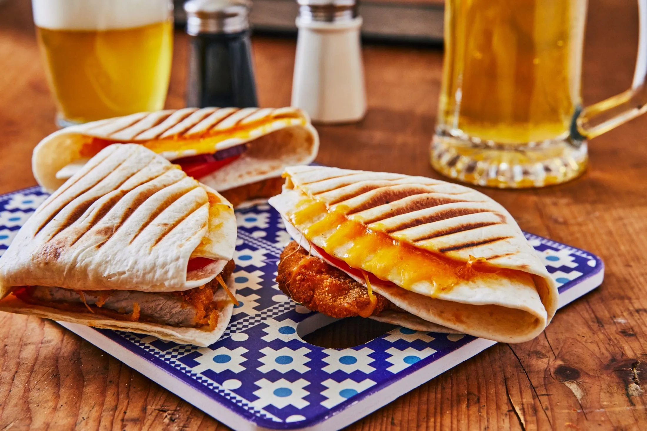 Rántott hússal, sajttal és zöldségekkel töltött tortilla-melegszendvics