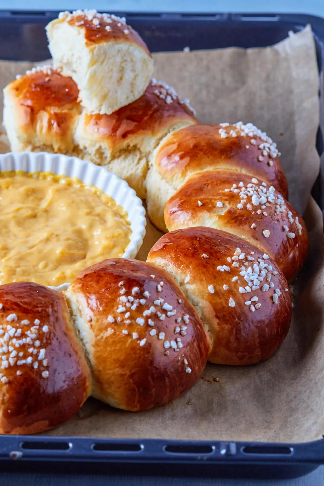 Közben az öntet hozzávalóit egy lábasba mérjük, simára keverjük, és közepes lángon, folyamatos kevergetés mellett besűrítjük, mintha pudingot készítenénk. Egy tálba töltjük a vaníliasodót, és berakjuk a brióskoszorú közepére, majd ebbe tunkolhatjuk a briósainkat.