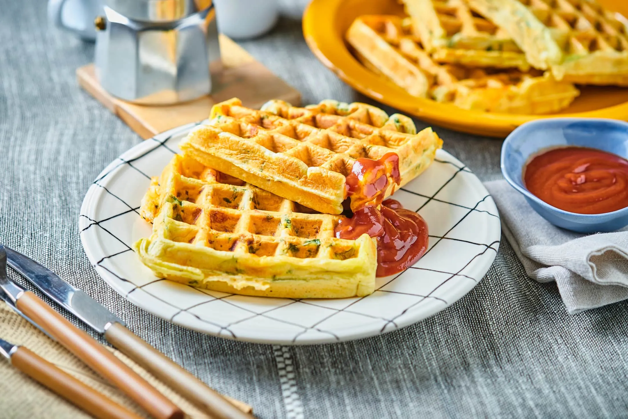 A reggeli gofrihoz először a sajtot lereszeljük, a spenótot durvára összevágjuk, a sonkát kis kockákra vágjuk. Összekeverjük a többi hozzávalóval, és az így kapott tésztát hagyjuk állni 10 percet. Gofrisütőben megsütjük a tésztát – összesen 8 db jön ki belőle. Ketchuppal tálaljuk.
