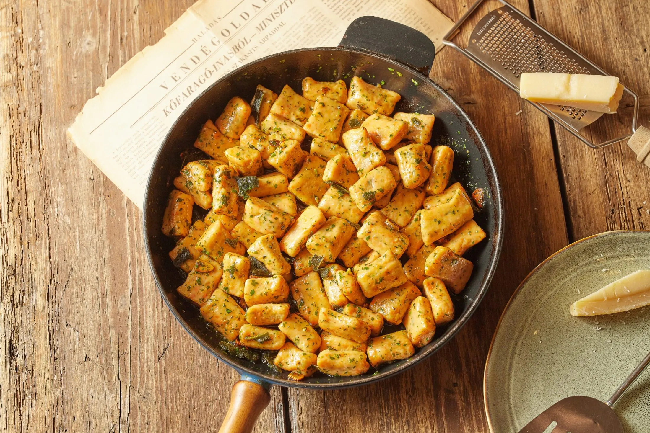Míg fő a gnocchi, addig a félrerakott vajat egy serpenyőbe öntjük és hozzáadjuk az 50 g friss vajat, amit addig pirítunk közepes hőmérsékleten, míg szépen elkezd barnulni és kissé diós illatot kap. Ekkor jöhet hozzá a vékonyra szeletelt fokhagyma, a zsályalevelek, a méz, só, bors és a finomra vágott petrezselyem, elkeverjük és ebben vajas mártásban megfürdetjük a kifőtt gnocchikat. Tányérba szedjük és tálalás előtt reszelünk a tetejére egy kis parmezánt.